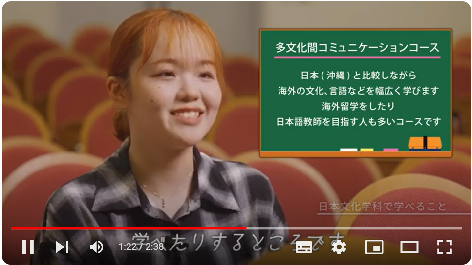 沖縄国際大学の受験生向け動画が4年ぶりにリニューアルすることになり、6月10日からの各地の高校での沖国説明会に合わせて、日本文化学科でも2年生の宮里さんが出演しているインタビュー動画が公開されることになりました。