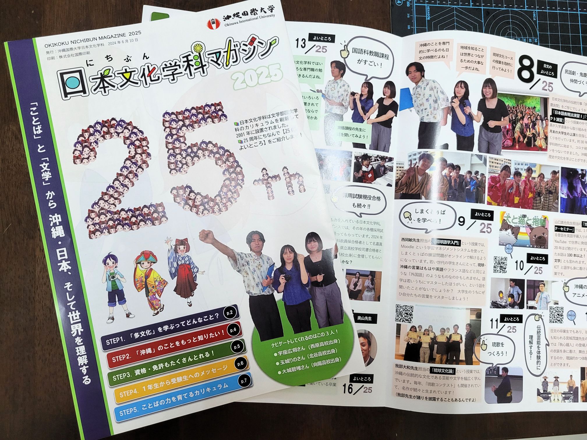 毎年、学科の先生と学生たちで協力して作っている、受験生向けの日本文化学科オリジナルパンフレット『沖縄国際大学日本文化学科(にちぶん)マガジン』。
