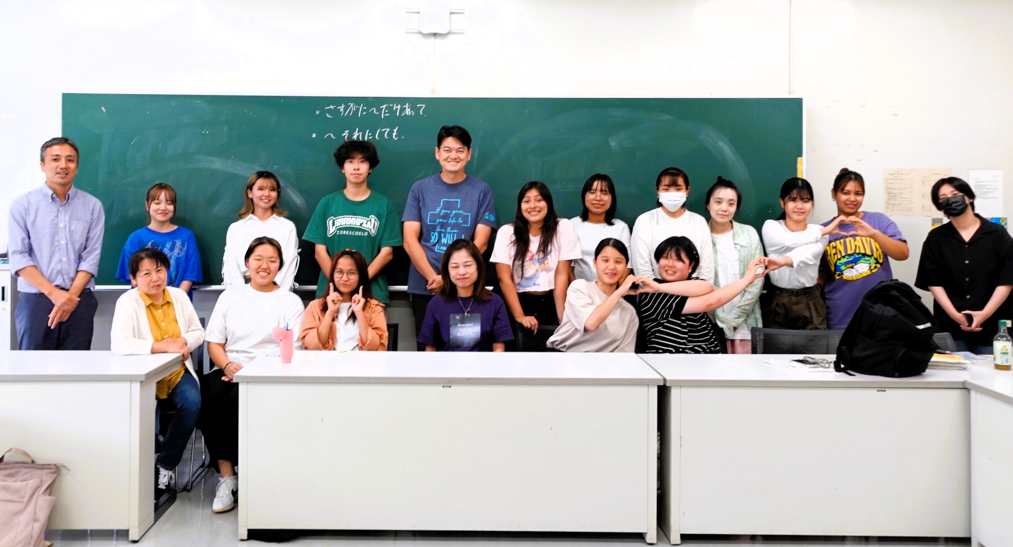 沖縄国際大学には、韓国、中国、インドネシア、香港、台湾、メキシコ、ミャンマー、ペルー、フランスなどなど、いろいろな国の留学生がいますが、授業の中では国籍に関わりなく、「日本語」という共通の言語で、みんなで楽しみながらつながりあっているところが印象に残りました。