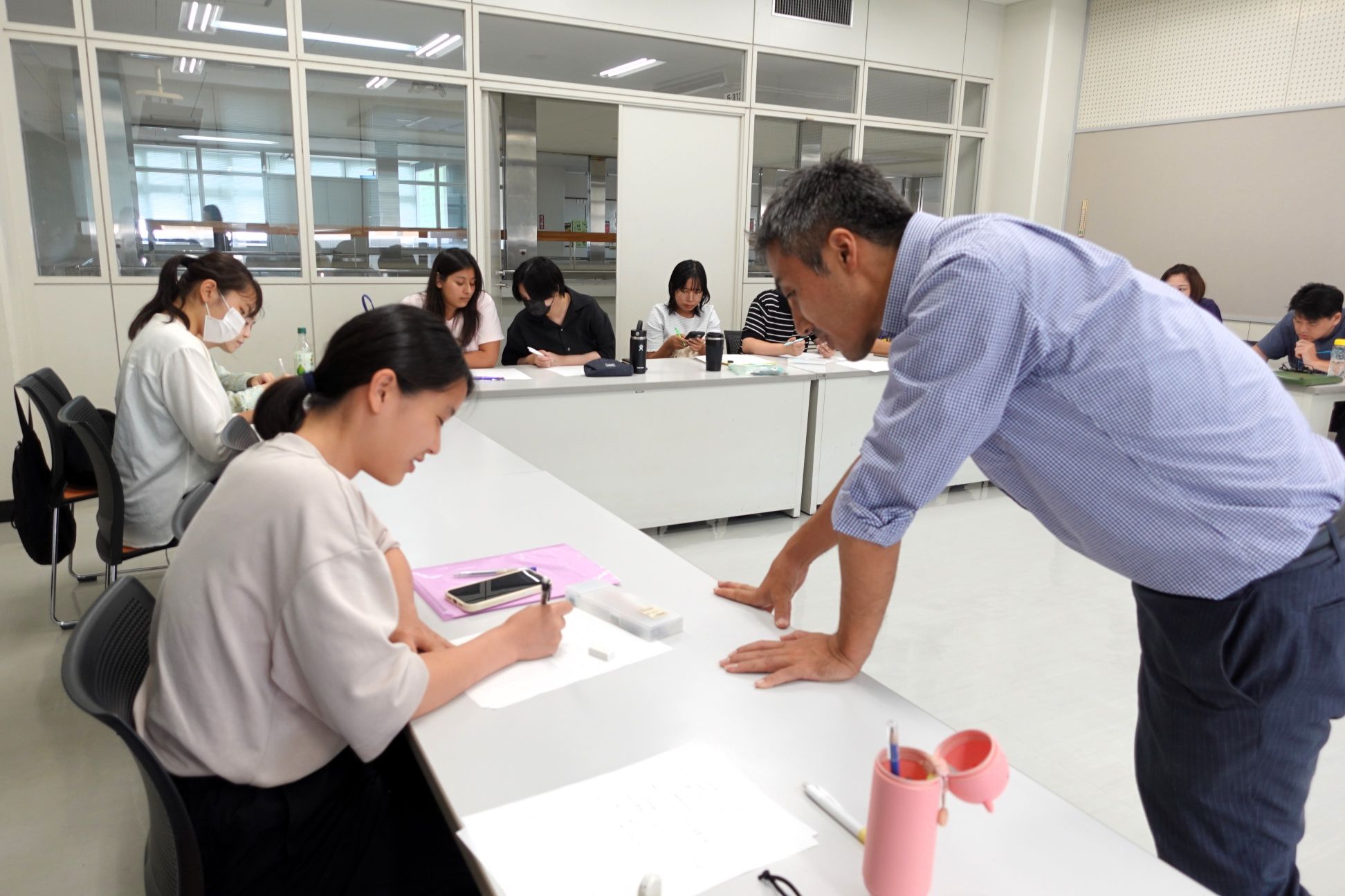 沖縄国際大学では外国人留学生が日本語を学ぶ科目が設置されており、日本文化学科の専任教員であり、日本語教師としての経験もある奥山貴之先生いたくさんの科目を担当されています。こうした留学生向けの授業は、多文化間コミュニケーションコースで学ぶ学生たちや、日本語教育副専攻課程にて日本語教師を目指す学生たちにとって、多文化と接することができる貴重な学びの場にもなっています。