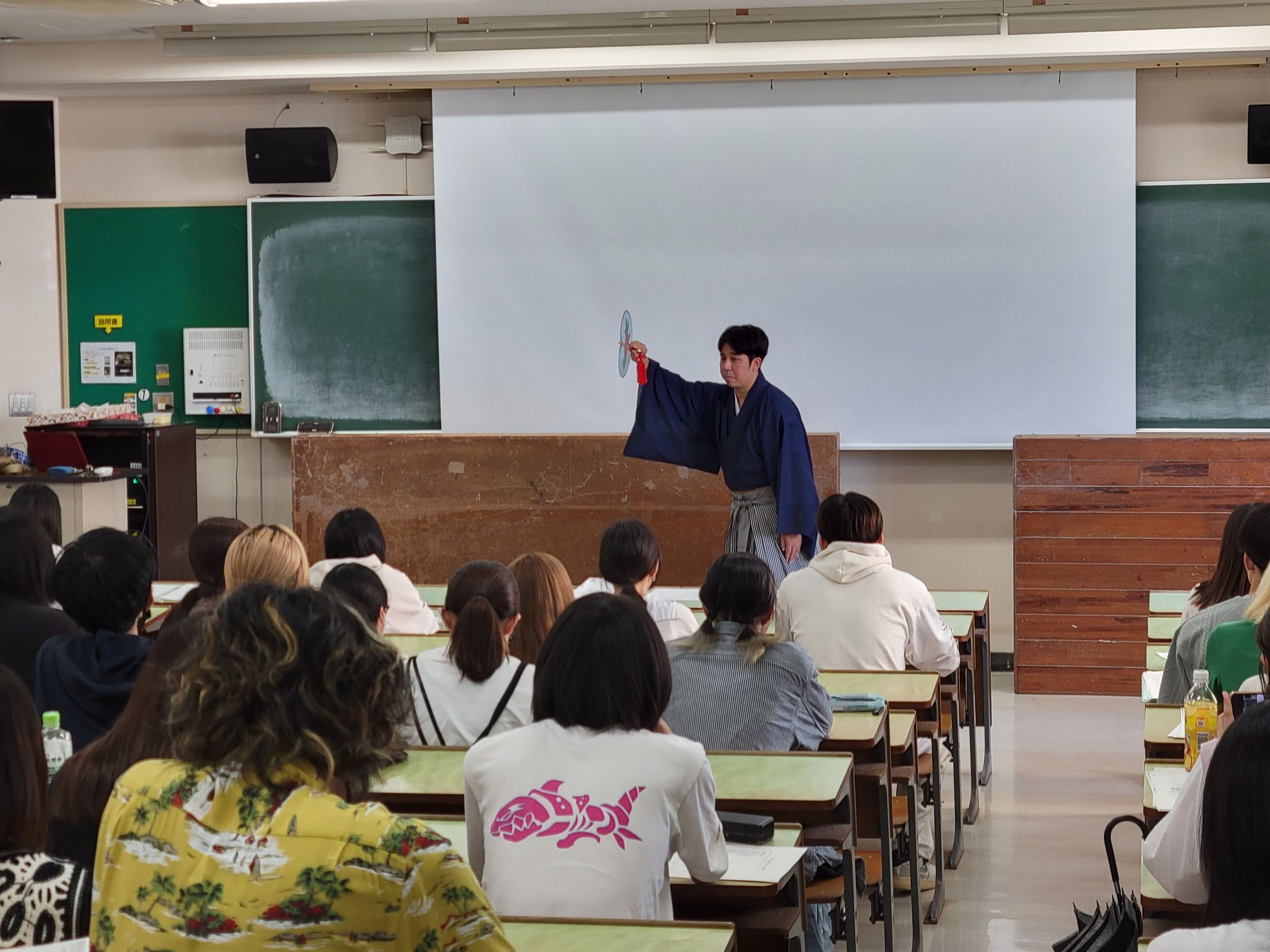 この授業では現在、琉球文学の一つである「琉歌」を取り扱っており、音楽と踊りにどのようにして行われているのかを学生に感じてもらうことを目的とした実演でした。
