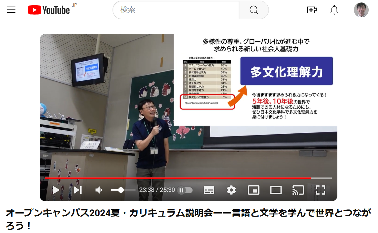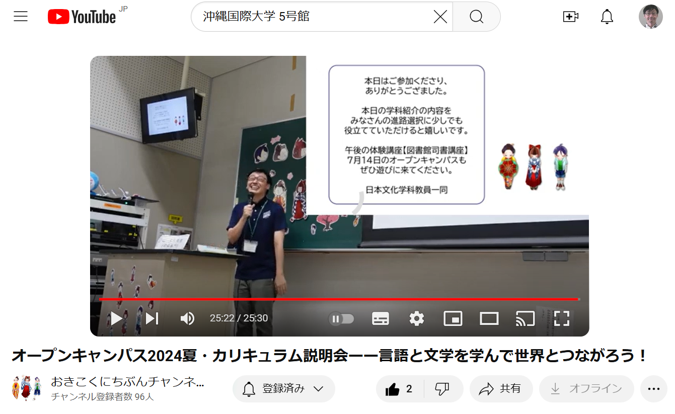 日本文化学科では、毎日のブログ更新ほどではありませんが、YouTubeの「おきこくにちぶんちゃんねる」を通して、学科の情報をほそぼそと、のんびりとお届けしています。そして、6月30日に開催された第1回オープンキャンパスの中での、学科カリキュラム説明会の様子もひっそりとアップしてみました。