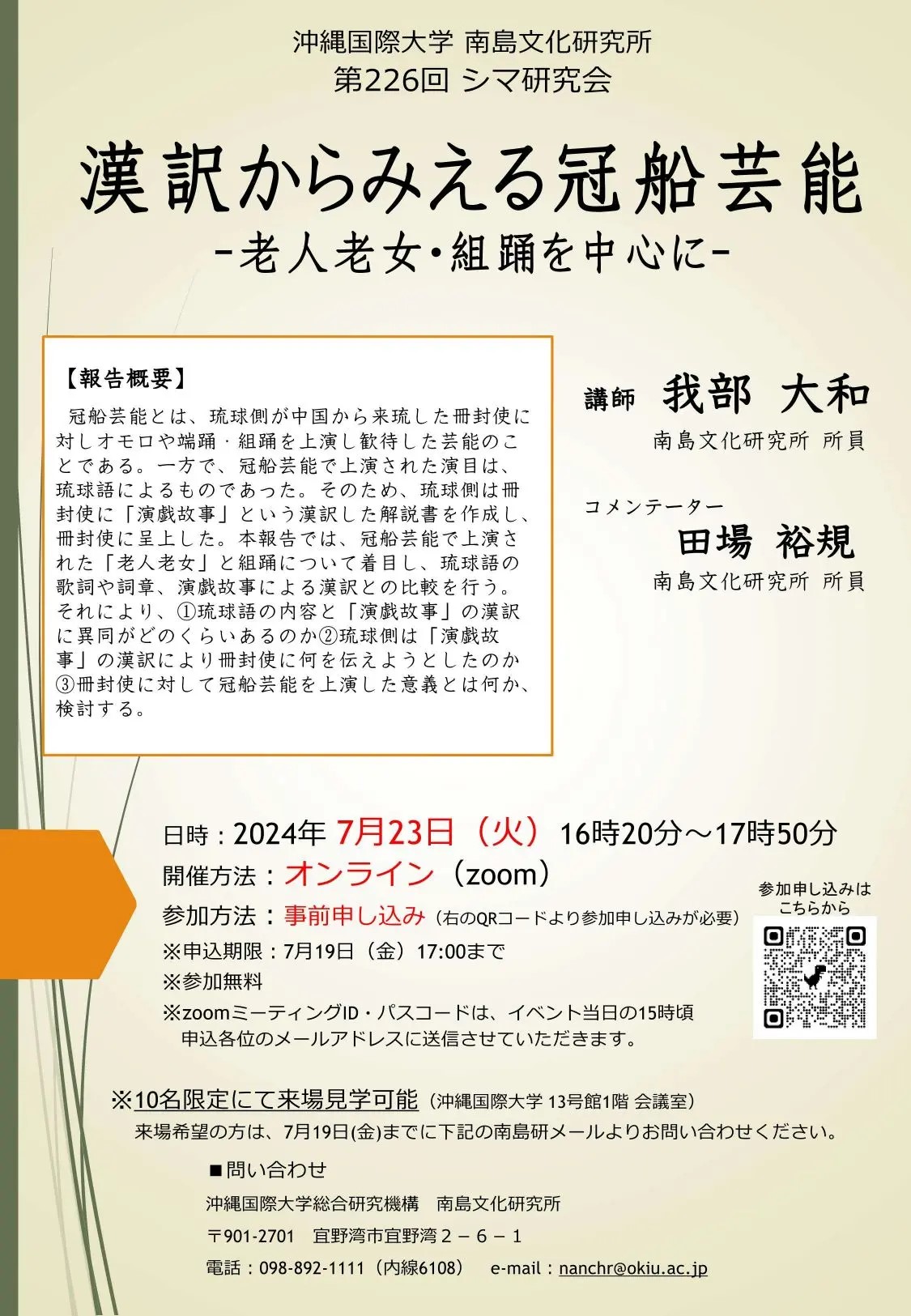 基本的にはオンラインでの開催となりますが、10名限定で来場見学可能(沖縄国際大学 13号館1階 会議室)です。
