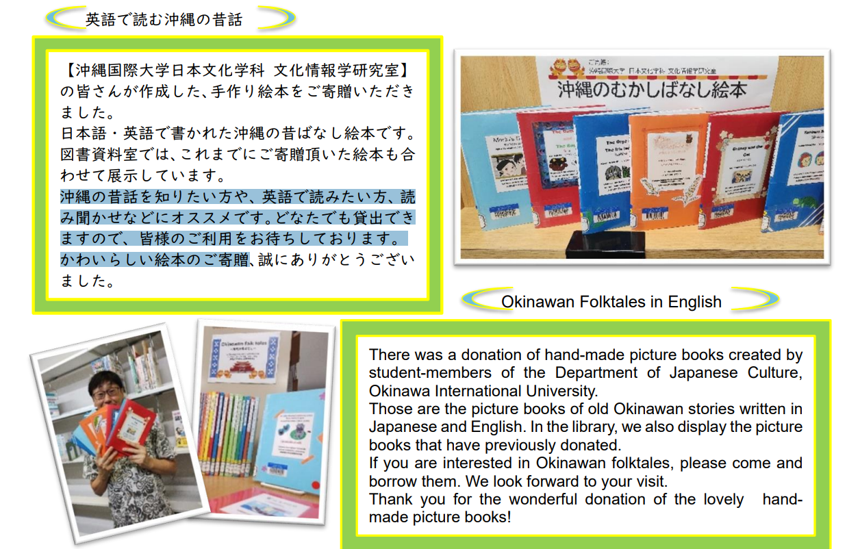 日本文化学科では、沖縄に古くから伝わる沖縄の昔話を、手作り絵本にして、各学校や図書館、公民館、地域文庫などに配布する活動を20年以上前からコツコツと続けています。最近では、多文化間コミュニケーションコースのモデル学習の1つとして、沖縄の文化を海外や県内で生活する外国人の方にも伝えるための英語版絵本も作成し、国際的な課題をテーマにした資料を多く扱うJICA沖縄の図書資料室にも寄贈させていただいています。