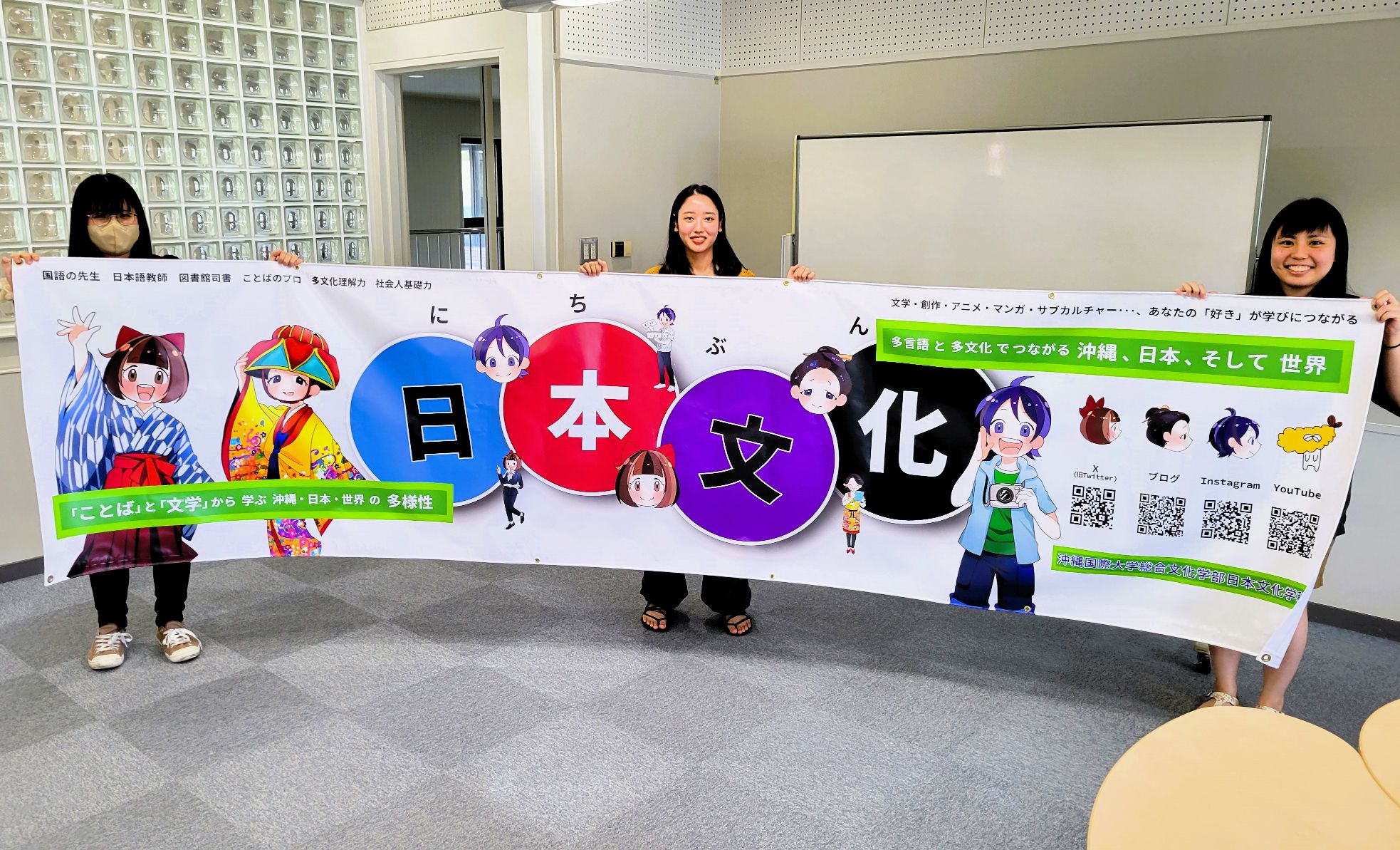 そして、学科広報用に大活躍してくれている日文のイメージキャラクタ―(球美さん・文子さん・ショーンさん)のデザインを今年から一新することになったので、それに合わせて、オープンキャンパス用の横断幕も作り直すことになりました。