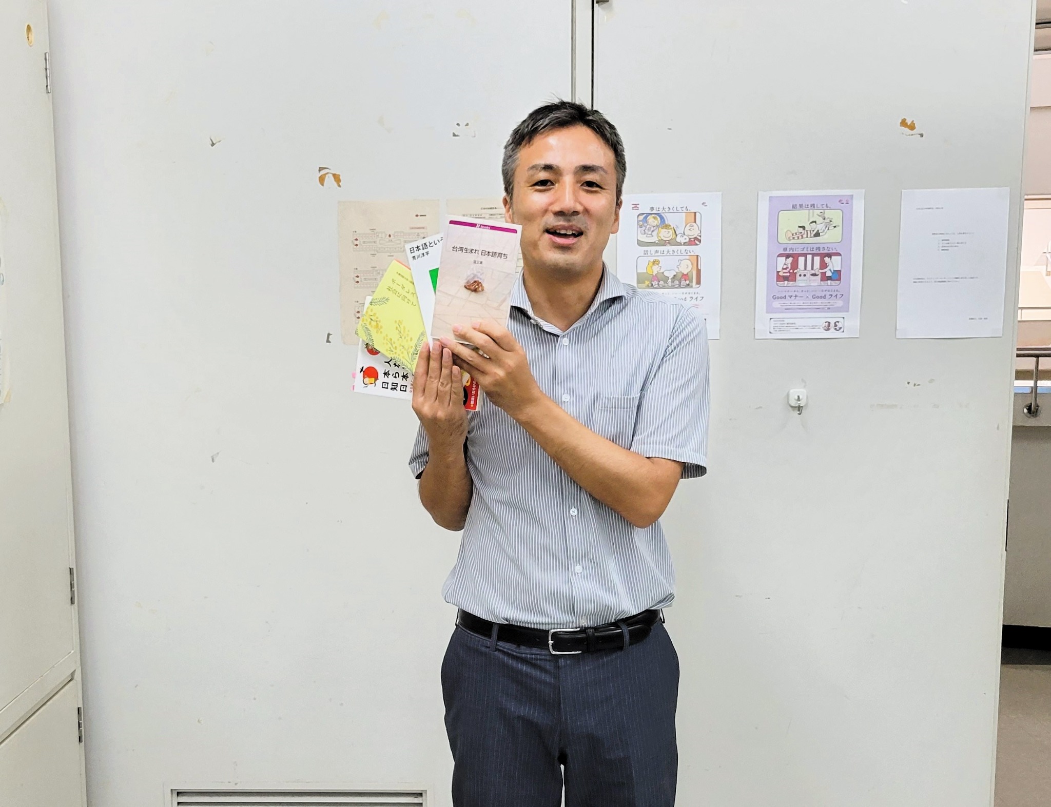 奥山先生が手に持っているのは、日本語教師を目指す受験生にぜひ読んでほしい本です。学校の図書館や街の図書館でぜひ読んでみてくださいね。