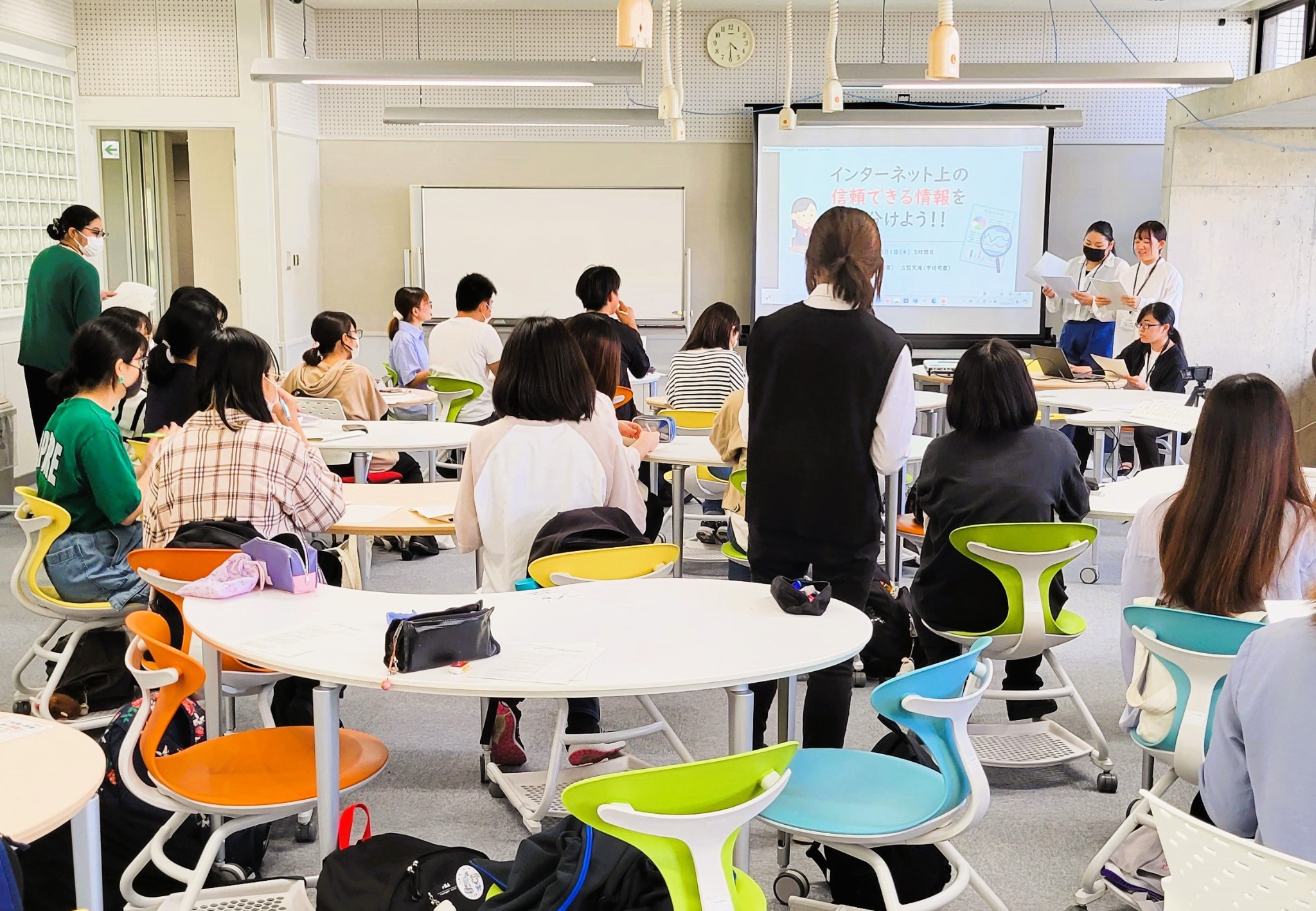 テーマ③「インターネット上の信頼できる情報の見分け方」では、探究学習においてインターネット上の情報を活用する場合に気を付けたいこと、信頼できる情報の見分け方をテーマとするガイダンスを行いました。