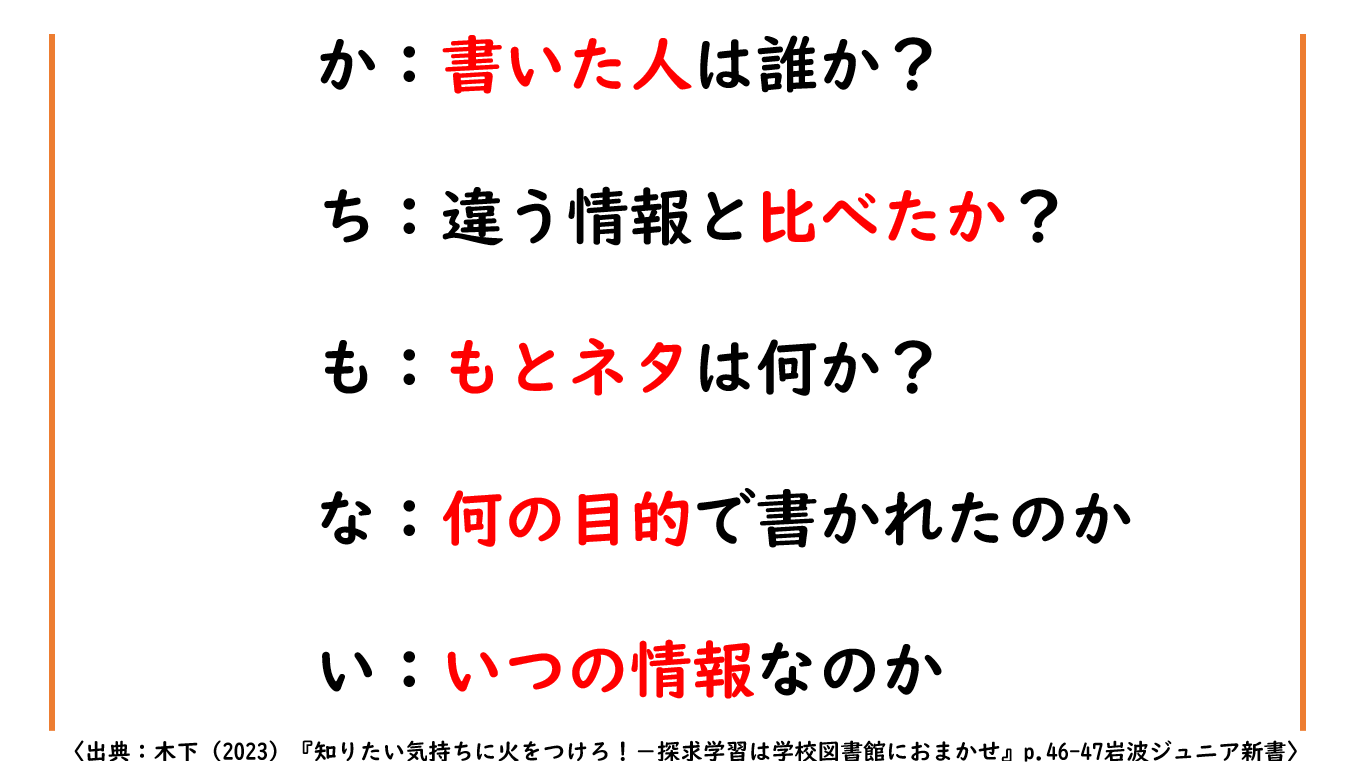 埼玉県の学校司書である木下通子さんの著書『知りたい気持ちに火をつけろ!-探求学習は学校図書館におまかせ』(岩波ジュニア新書)などを参考に、前の時間で各自が集めたホームページの情報が、この5つのポイントにきちんと当てはまるかどうかをチェックするワークも取り入れて、とても興味深い説明になっていました。