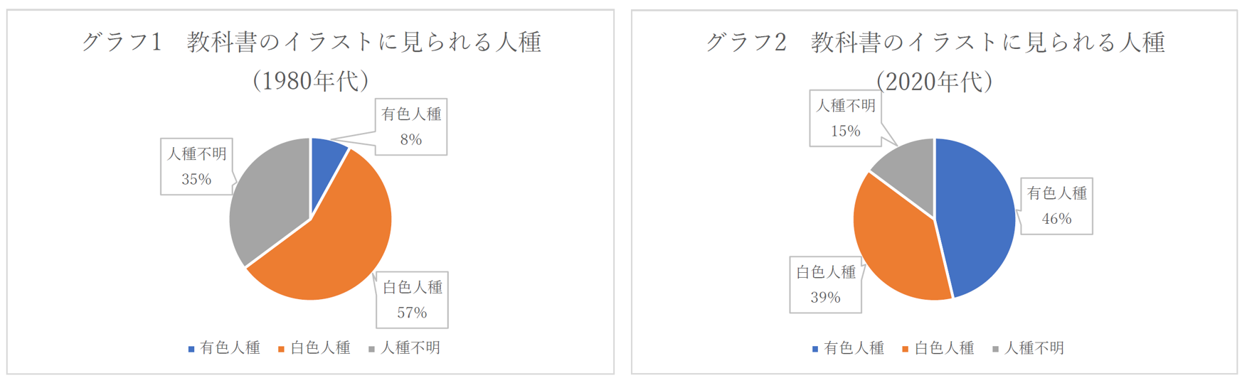 「英語の教科書における人種差別的表現の実態:1980年代と2020年代の教科書を比較して」は、中学校の英語教科書に出てくる外国人の人種に偏りがないか、を調べたものです。英語を使う=白人、アメリカ人、というわけではありませんが、なんとなく、1980年代の日本の教科書には白人が多く描かれやすいのではないか?、人種の多様性を尊重していない、差別的なイラストが多いのではないか、という仮説を立てて調べたものです。以下の2つのグラフを比較するとわかるように、仮説通り、1980年代の英語を使う外国人といえば白色人種という偏りがみられ、2020年代以降の新しい教科書では人種の多様性に考慮して、有色人種の比率がかなり高まってくる、アメリカ人だけでなく、中国人なども登場する、という変化がみられました。