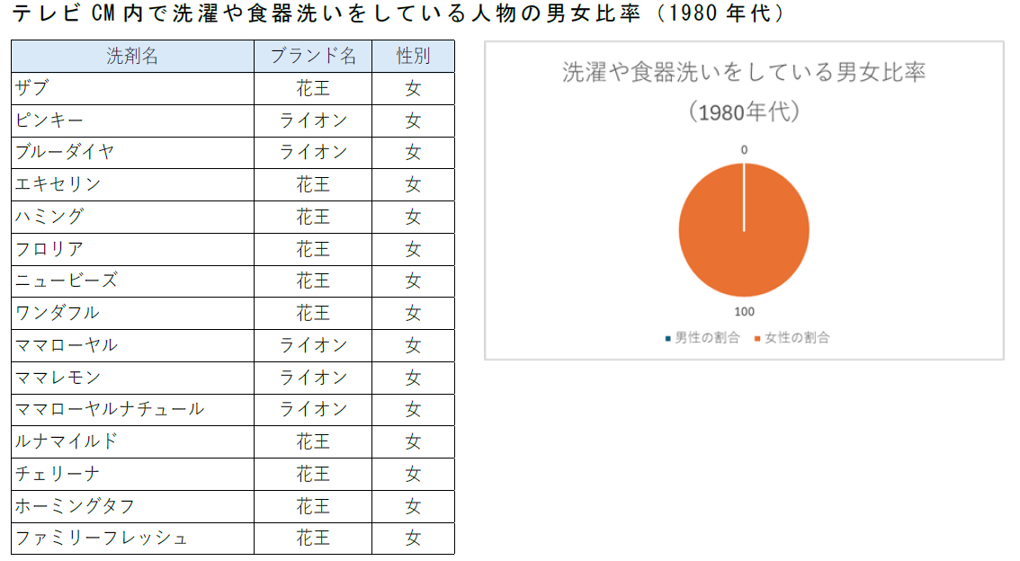 「広告表現にみるジェンダー・バイアス」では、車のCMや食器用洗剤のCMに注目して、男性、女性のどちらが登場するか、1980年代と2020年代のCMを比較した結果がまとめられています。食器用洗剤は最近のCMでは、男性が登場したり、男女が両方登場したり、その男女も必ずしも夫婦ではなく、姉弟だったり、と多様な家族観を意識した表現になっているように思えますが、1980年代のCMをYOUTUBEで調べた結果をみるといかのように、登場するのはすべて女性、しかも主婦的な若い女性、という結果が示されています。1980年代は食器を洗う=家事は若い女性の仕事で、CMに描かれるような幸せな生活の象徴は、女性が家庭に入って家事をすること、という意識があったことがわかります。
