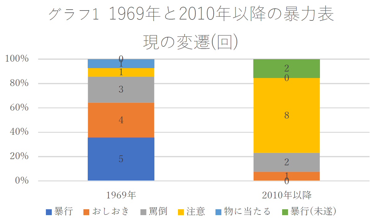 「長期放送アニメにおける暴力表現の変遷: 放送初期と現在の描写を比較して」では、長寿アニメ番組「サザエさん」の中の、名物シーン、浪平からカツオへのお説教シーンに注目して、暴力的な行為がどのように変化しているかを調査しました。サブスクの配信では1980年代の「サザエさん」が収集しづらかったため、「サザエさん」放送開始時期にあたる1969年と、現代の「サザエさん」を比較したところ、以下のグラフのように、浪平によるお説教に伴う暴力行為は、物置に閉じ込めるといった体罰的な表現も含めて、現代の作品ではほぼみられなくなっている、ということがわかってきました。
