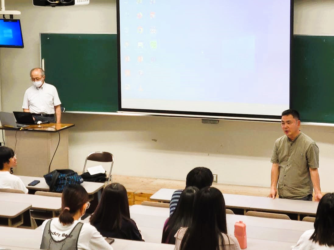 初回の授業ではこの講義の世話役である田場裕規先生から、佐藤先生のご紹介と、多文化間コースのまなざしの一つとして、アイヌの言語文化を沖縄国際大学日本文化学科で学ぶことの意義についてのお話もありました。