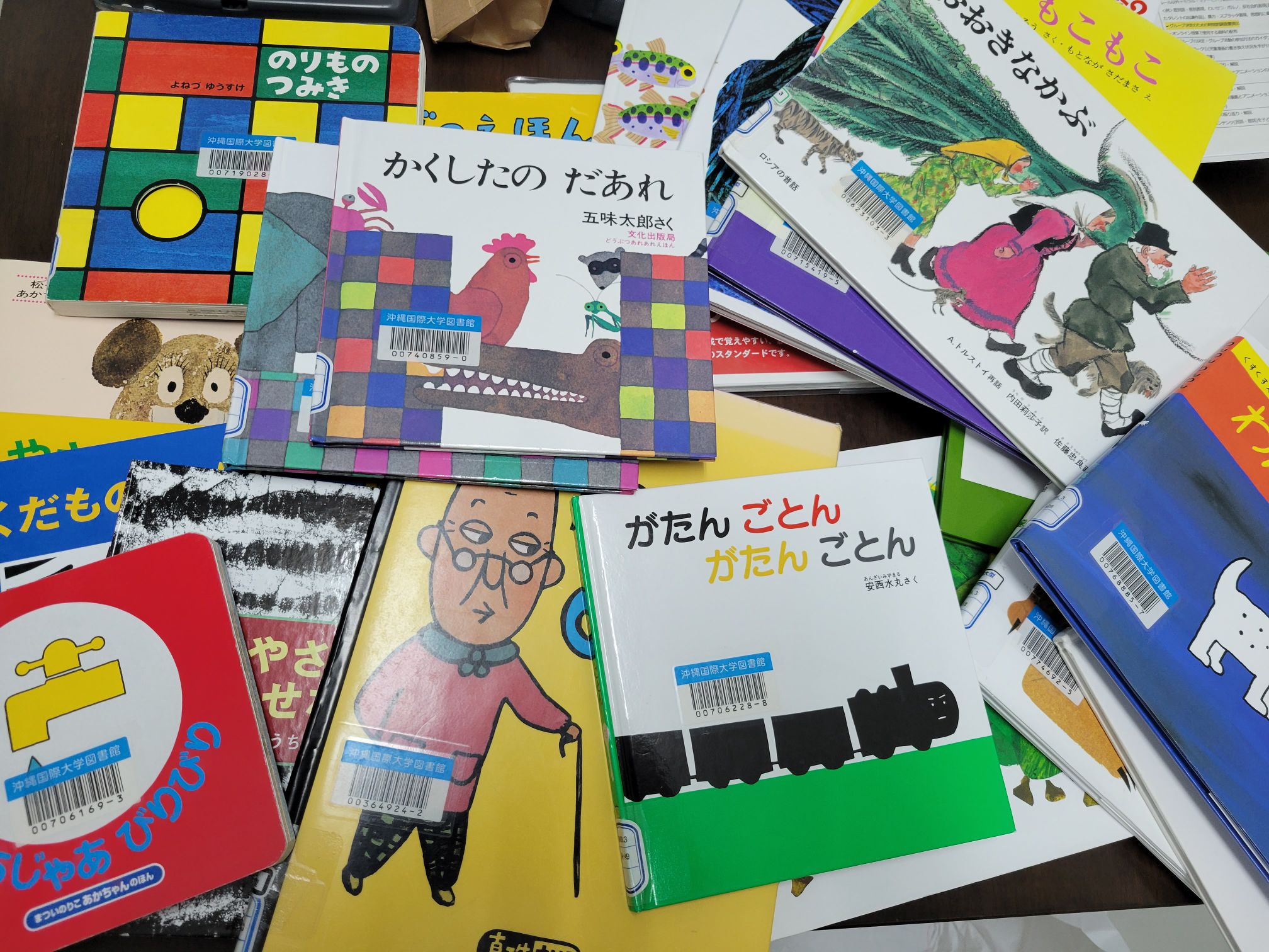 沖縄国際大学図書館は、公共図書館のように子ども向けの資料はそれほど多くありませんが、図書館学を学ぶ学生のための教材として、絵本については大型絵本なども含めてかなり多く収集しています。