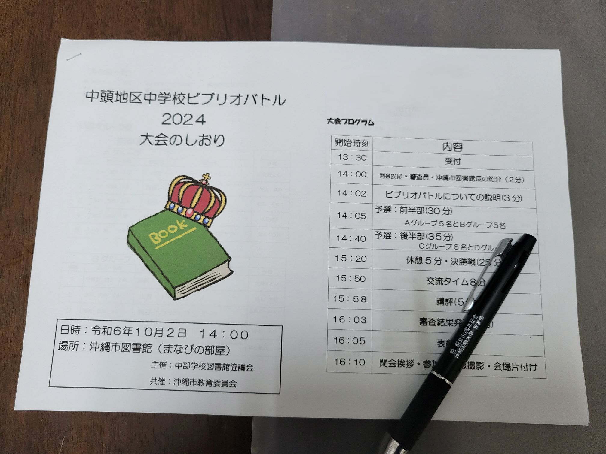 2024年10月2日に沖縄市立図書館まなびの部屋にて開催された「中頭地区中学校ビブリオバトル2024大会」には、日本文化学科で図書館情報学ゼミを担当している山口先生が審査員として、また図書館情報学ゼミの学生もお手伝いに参加し、各学校の代表者22名によるビブリオバトルを見させていただきました。