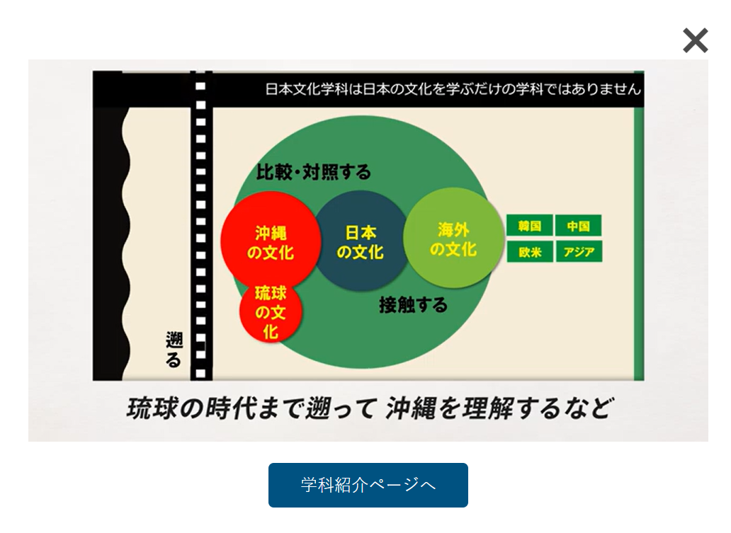 その範囲は日本だけにとどまらず、日本と比較しながら、世界の文化へ関心を広げたり、逆に、地元の沖縄の文化に特化して学んだり、琉球の時代までさかのぼって沖縄を理解するなど、様々な世界線へ旅することができるのも日本文化学科のカリキュラムの特徴です。