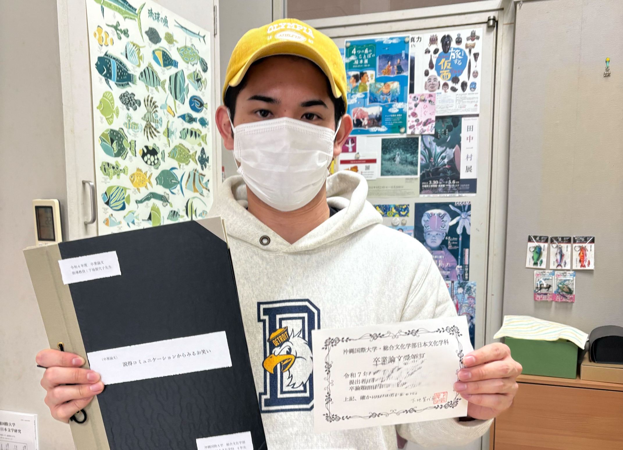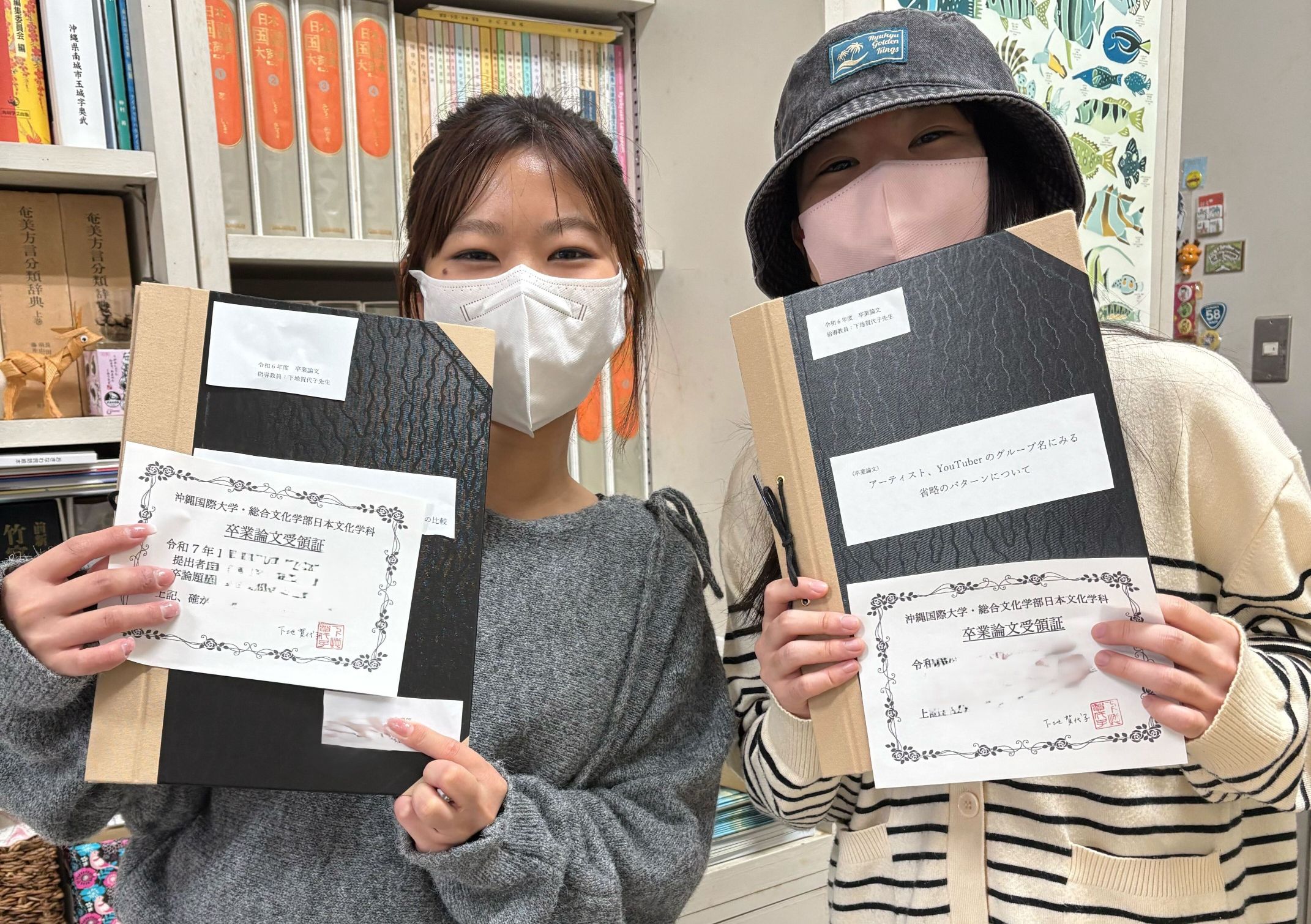 日本文化学科では卒業論文の執筆が全研究室で必修となっており、日本語学・言語学、国語教育学、日本文学、琉球語学、琉球文学、古典芸能、日本語教育学、サブカルチャー論(アニメ・マンガ・映画・音楽など)、多文化間コミュニケーション論、図書館情報学、文化情報学、出版流通問題などなど、専門科目で学ぶ知識を土台として、各自が様々な興味関心に応じて自由にテーマ・題材を設定し、仮説を立て、インタビューやアンケート、観察・実験等を通してそれを検証し、分析していくスタイルで行われています。卒論の分量は人それぞれですが、多い人は原稿用紙で100~200枚以上になることもあります。