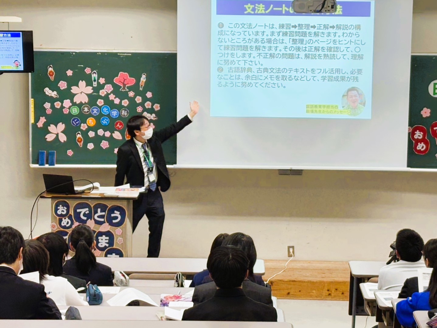 このガイダンスでは、来年度春からの大学生活に向けて、1年生の学年主任の山口先生から、入学前課題に取り組む意義、学校推薦型入試の合格者に与えられた大学入学までの3か月という長い期間をどう有意義に使うか、など、様々なアドバイスがありました。
