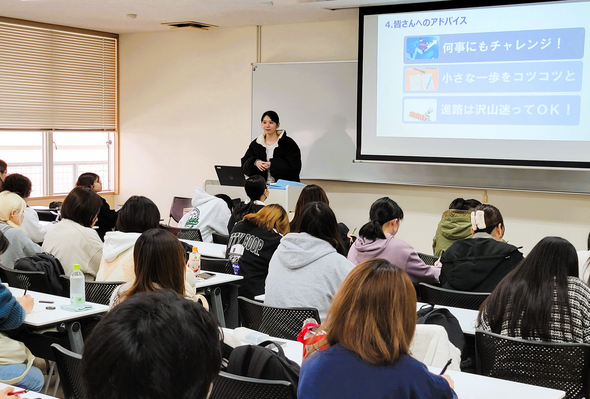 「私たちの世代は入学した最初の前期の期間はほぼすべての科目がオンラインで、正直言って、大学生活を楽しいと感じることが少なかった。1年生の後期になって、大学祭で民話劇「鬼慶良間」にみんなで取り組んでから、どんどん大学生活が面白くなった。資格課程を途中でやめて目標を見失ってしまった時期もあったけど、3年生になって文学ゼミに入ってから、授業がどんどん楽しくなって、就活にも力を入れることができた。大学生活が楽しいかどうか、ということと、就活は連動しているところがあると思うので、毎日の授業も就活もどちらも大切にしてほしい」