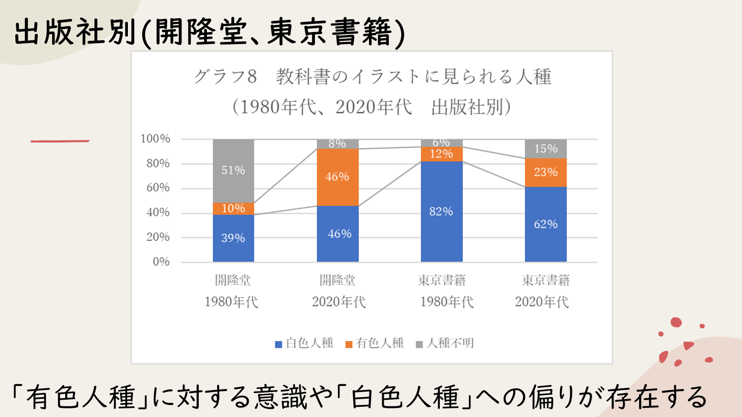 1冊の教科書に出てくる外国人のイラストは何十人にもおよぶため、そのひとり一人を分析していくくのはかなりのスケールになります。丁寧な調査、分析の結果、当初の仮説通り、1980年代の教科書の多くは、英語を使う外国人=白色人種、かつ鼻が高い、金髪といったステレオタイプ的表現がみられること、2020年代に入ると多様な人種、特徴をもつ人々が描かれるようになること、などが明らかとなっただけでなく、出版社別に分析すると、1980年代であっても、すでに人種の多様性に配慮した会社があった、という意外な結果も示され、会場からは驚きの声が聞こえてきました。