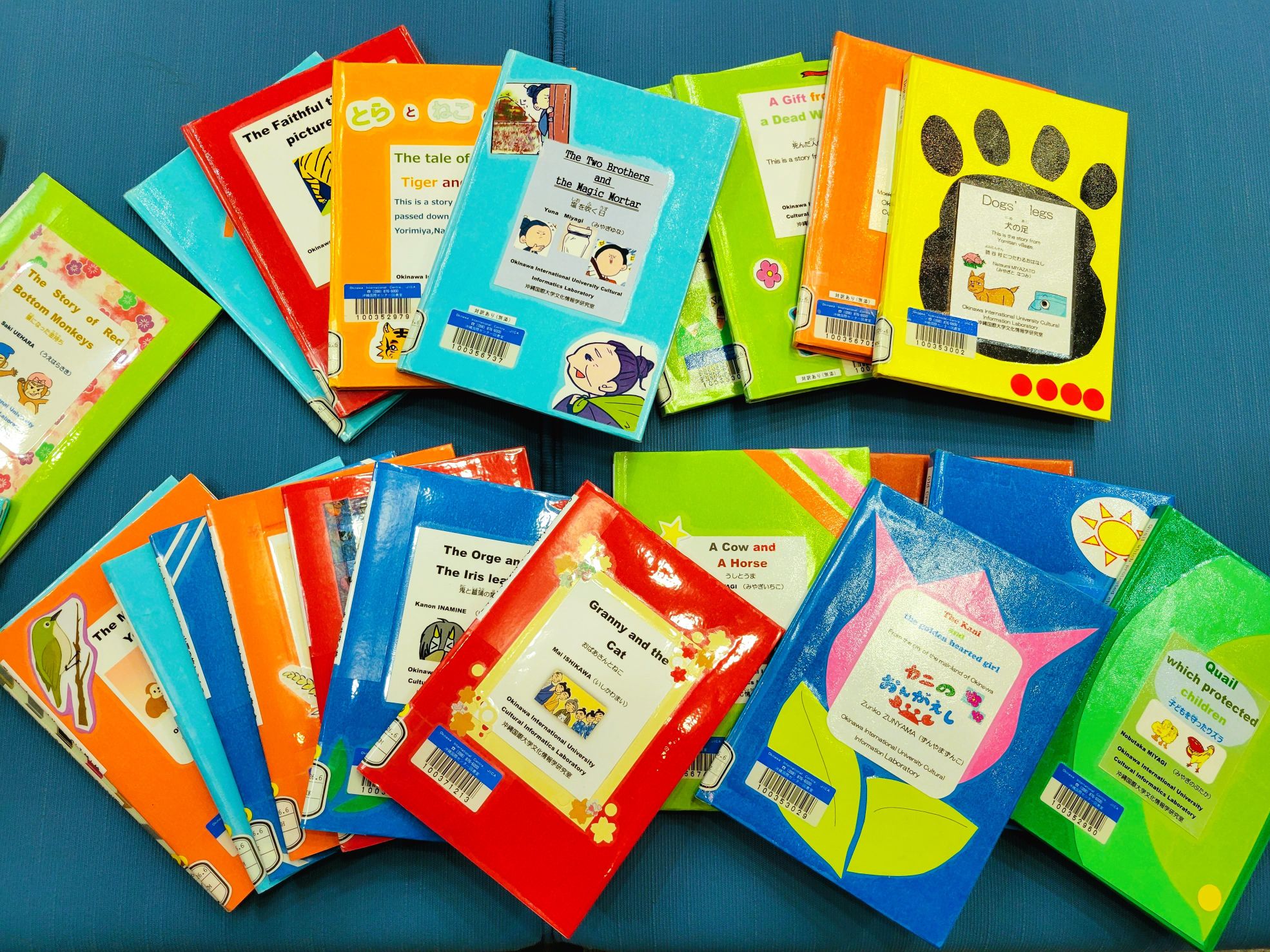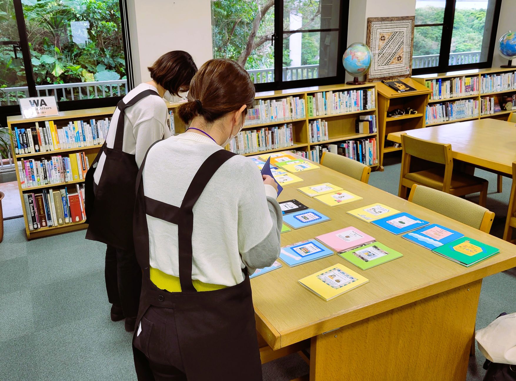 ふだんの利用者層を想定して、イラストの上手さだけでなく、服装や髪型、自然の様子など、沖縄の文化を外国から来た研修生にわかりやすく、正しく伝えることができる絵本を選んでいただけたようです。
