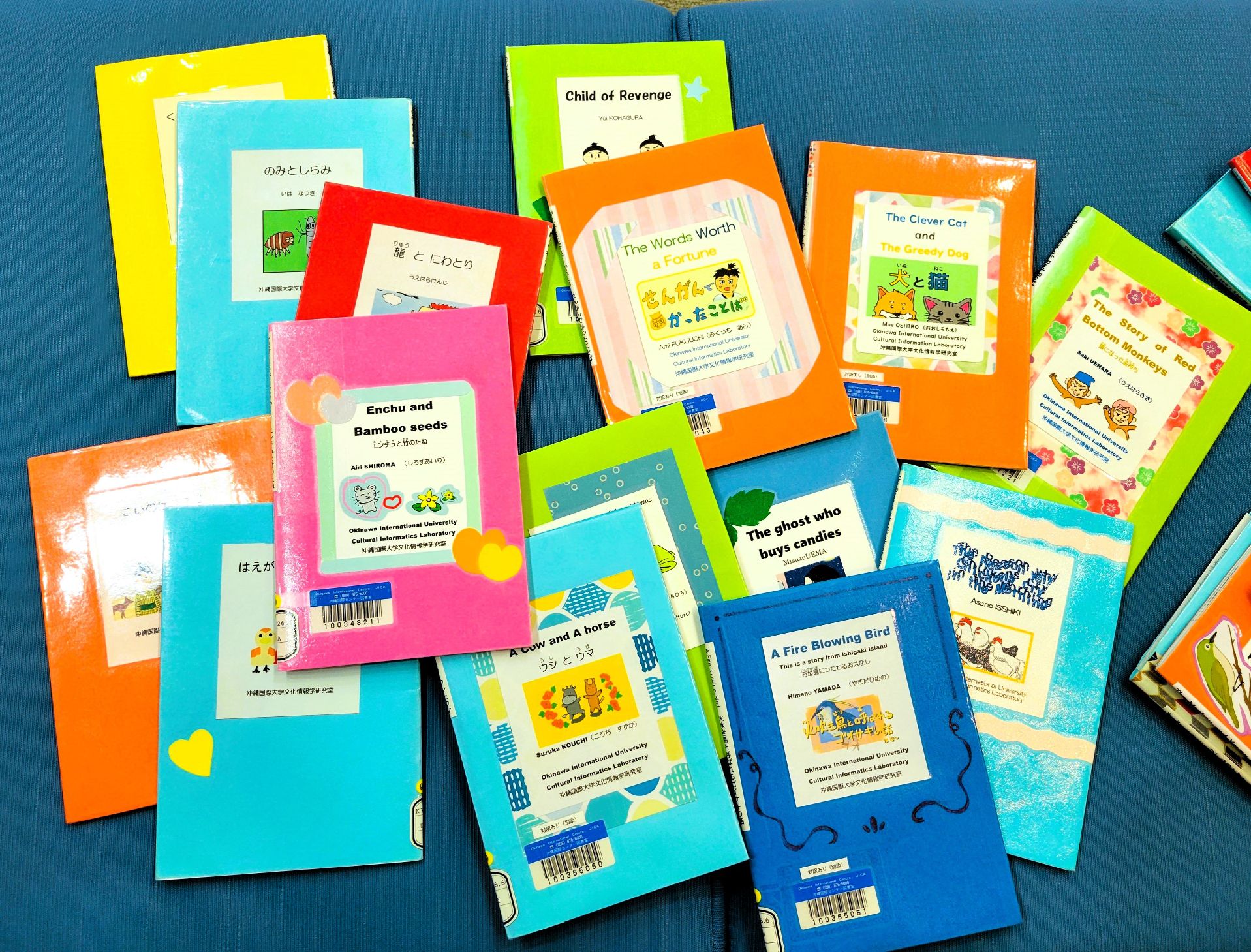 日本文化学科では、3年生から受講できるアドバンスド科目の1つとして、「児童文化論」「アカデミック・セミナー」という1年間の科目を通して、沖縄に伝わる民話・昔話を子ども向けにアレンジし、PCを使ってイラスを描き、英語に翻訳して、世界に1冊しかない手作りの絵本をつくり、地域の読書施設に届ける活動を15年近く続けています。