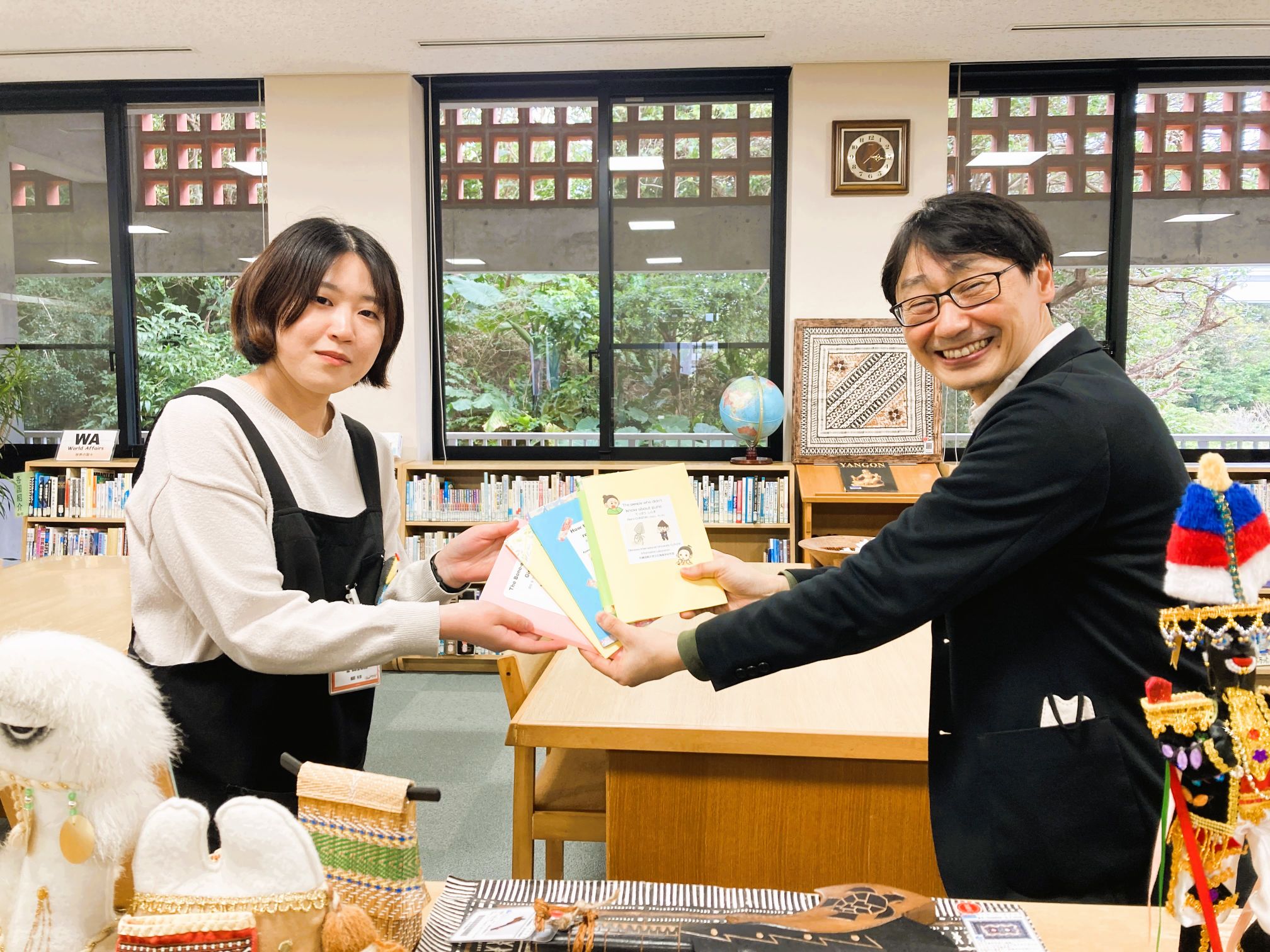 今年もたくさんの絵本が完成しましたので、日頃から司書課程の実習でもお世話になっている、JICA沖縄の図書資料室に絵本を届けにお伺いしました。例年は学生といっしょにお伺いしますが、今年は日程の調整が難しかったので、、授業担当の山口先生が代表してお伺いしました。