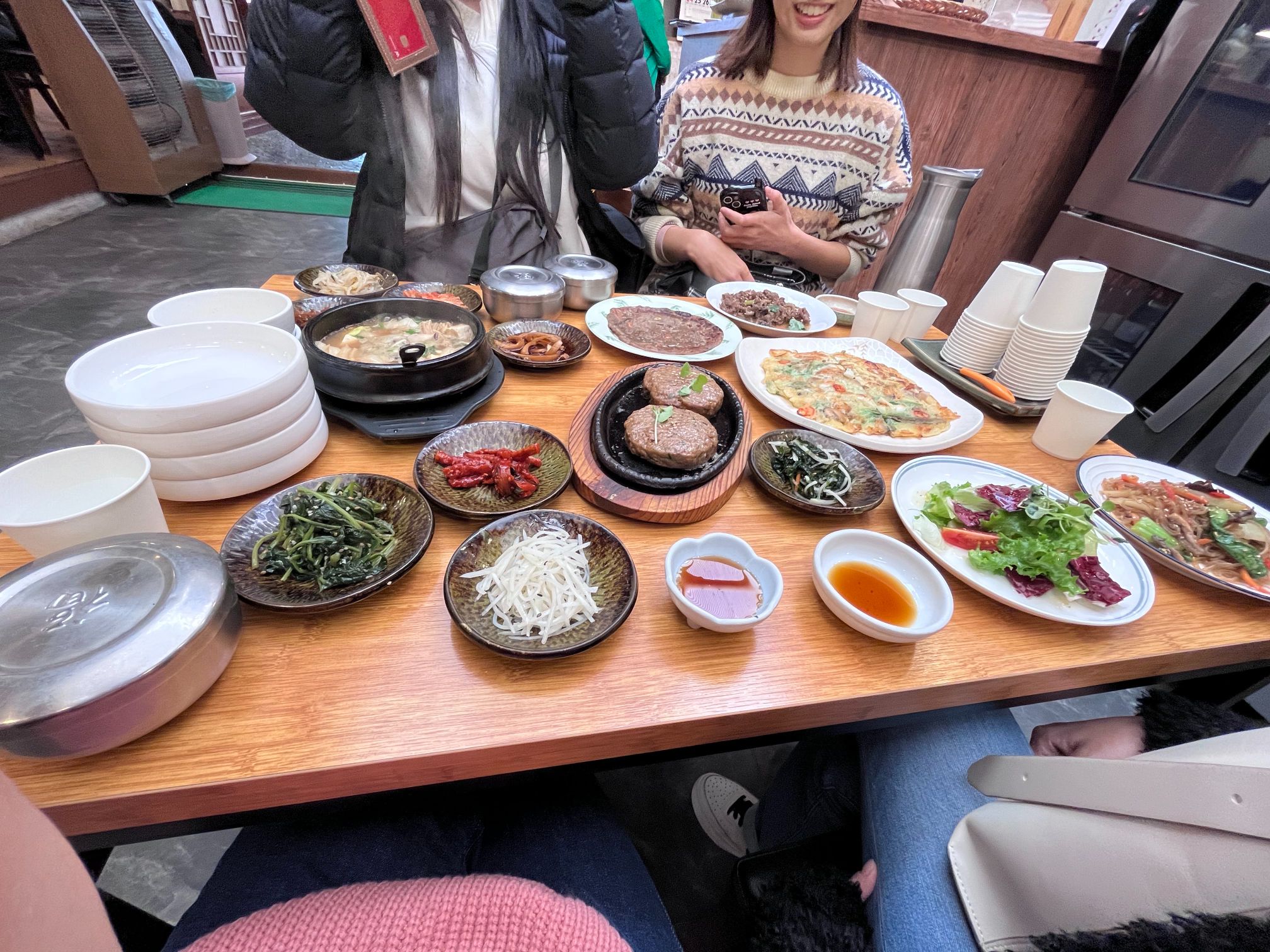 ●今回の実習を通して、日本、沖縄と韓国の文化の違いをもっとも実感したのは「食事」です。同じお箸でも日本とはマナーが違ったり、市場で「全然辛くないよ」と言われて食べてみたトッポッキがしっかり辛かったり。それでも、辛さの中にもおいしさが感じられたのが驚きでした。沖縄の料理では辛さを感じる料理は少ないように思いますし、「辛さ」を「おいしい」と捉えることは少ないようにも思いました。こうした食文化の違いがどのように生じているのか、といったことも考えながら、食事のたびに新鮮なことが多く、毎回おいしく、楽しみながら学ぶことができました。