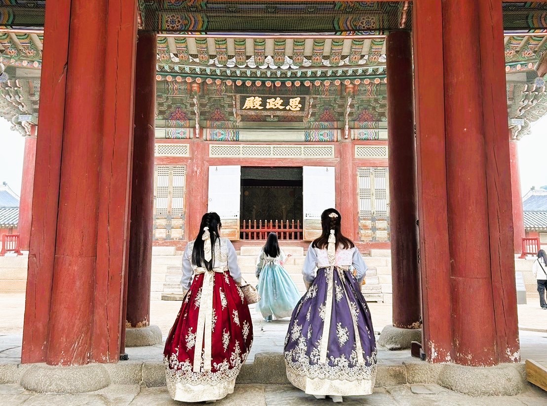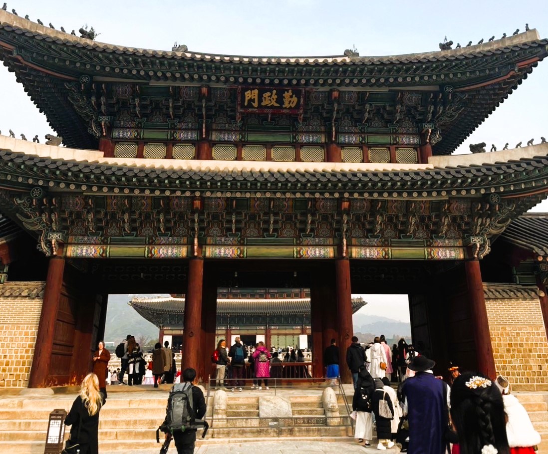 ●今回の韓国実習で特に印象に残っているのは、2日目に訪れた景福宮です。ここでは、韓国の伝統衣装である韓服を着て宮内をまわることができます。景福宮の周りには韓服をレンタルしてくれる出店が多くあって、私たち以外の観光客の方も韓服を着て観光している方がほとんどでした。