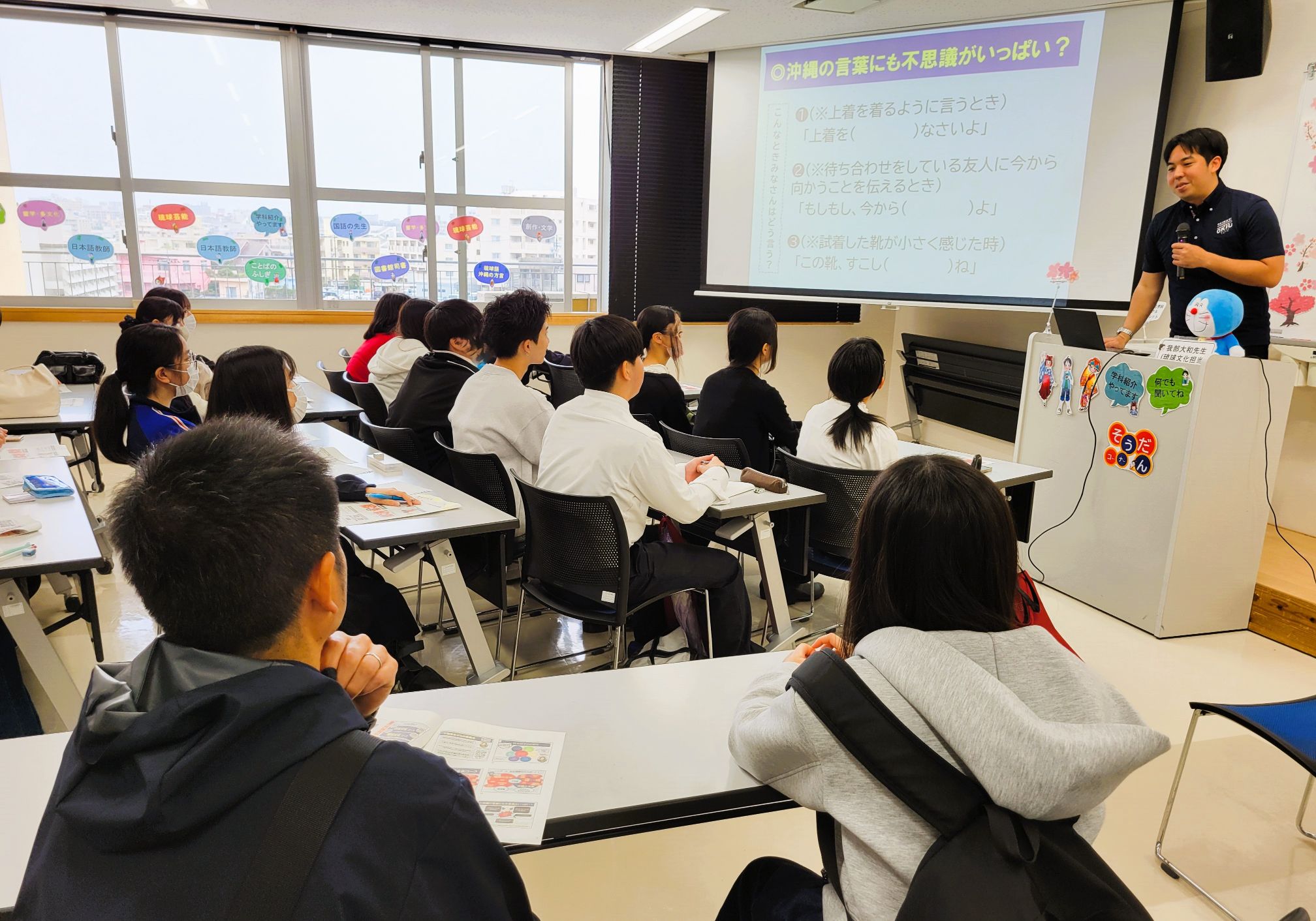 説明の後には、我部先生による「ウチナーヤマトゥグチ」のクイズ大会も開かれ、ふだん私たちが何気なく使っている言葉の中には実は共通語とは少し用法が異なる新しい言語が生まれつつあり、そうした言語は、琉球語と日本語、または英語などと接触することで新しく生み出されている可能性がある、ということを楽しく学びました。