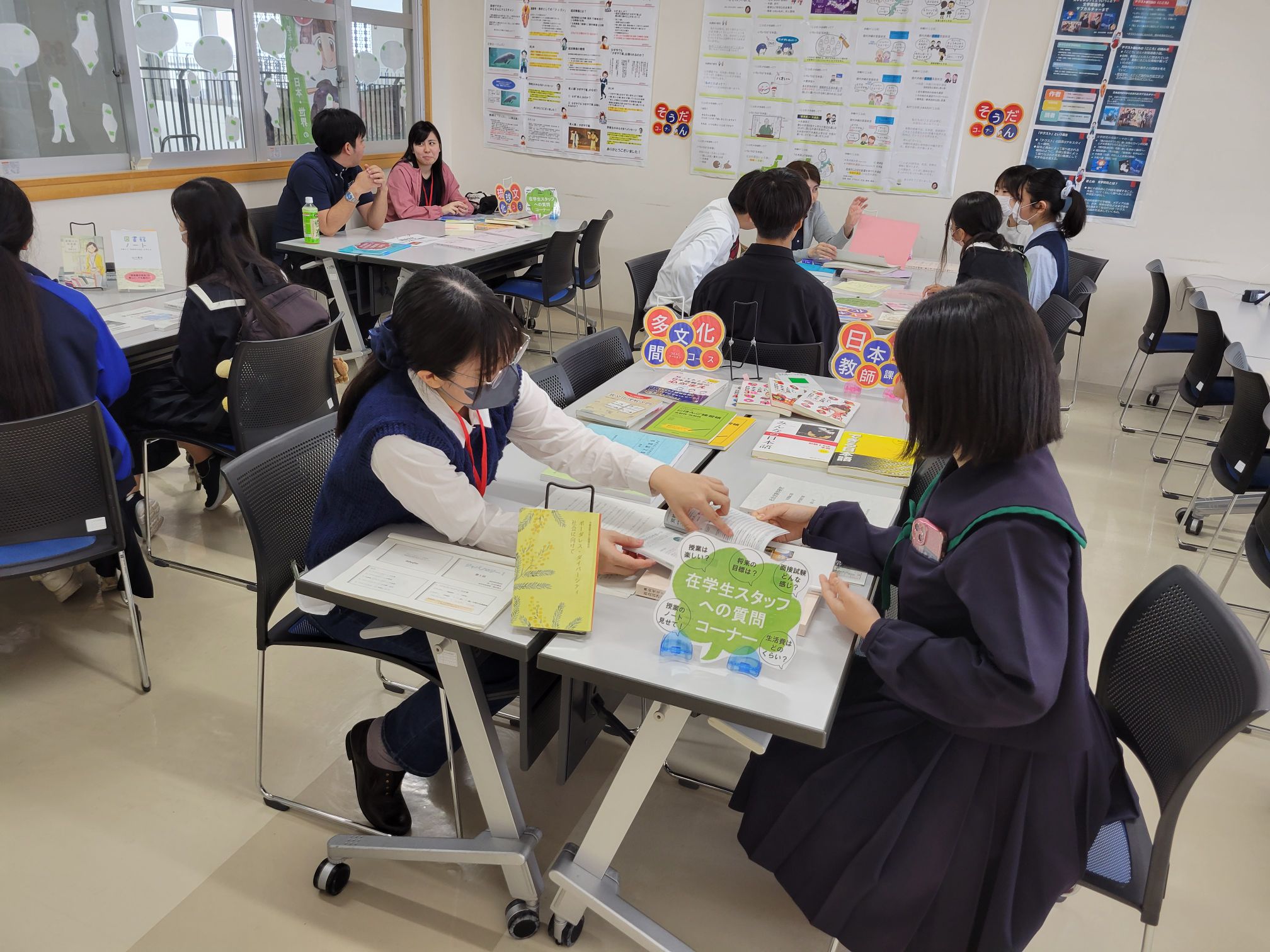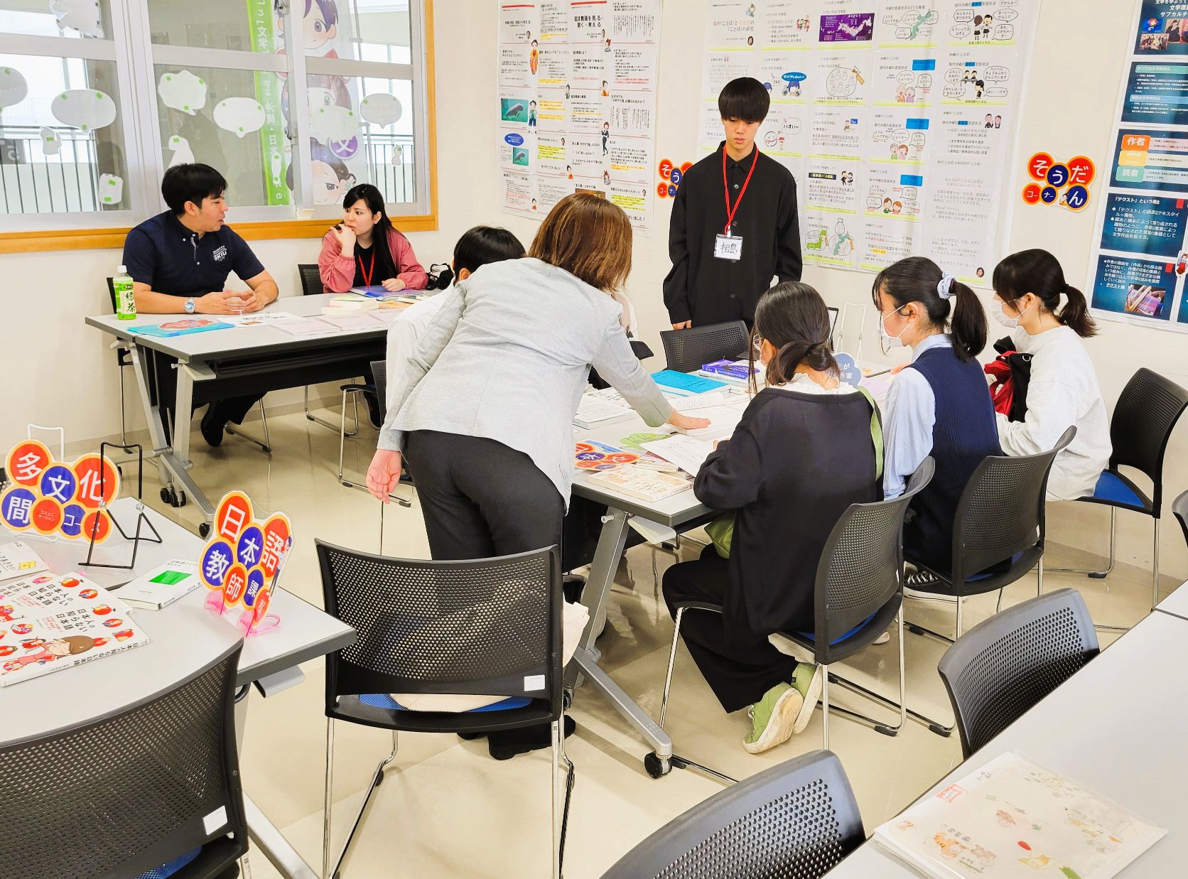 先生たちによるプレゼン生が終わった後は、国語科教員、日本語学、文学・創作、日本語教師、留学、図書館司書、琉球語・琉球芸能、といったテーマごとにブースを作り、卒論集を展示したり、学生たちが使っている教科書やノートなどをみてもらう時間をとりました。