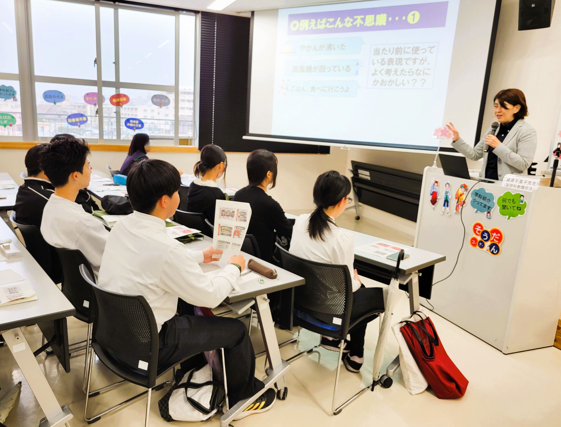 桃原千英子先生による言語文化情報コースでは、「ことばの不思議」に注目する「言語学(日本語学)」について、「やかんが沸いた」「扇風機が回っている」「ごはん、食べに行こうよ」という文例をもとに、