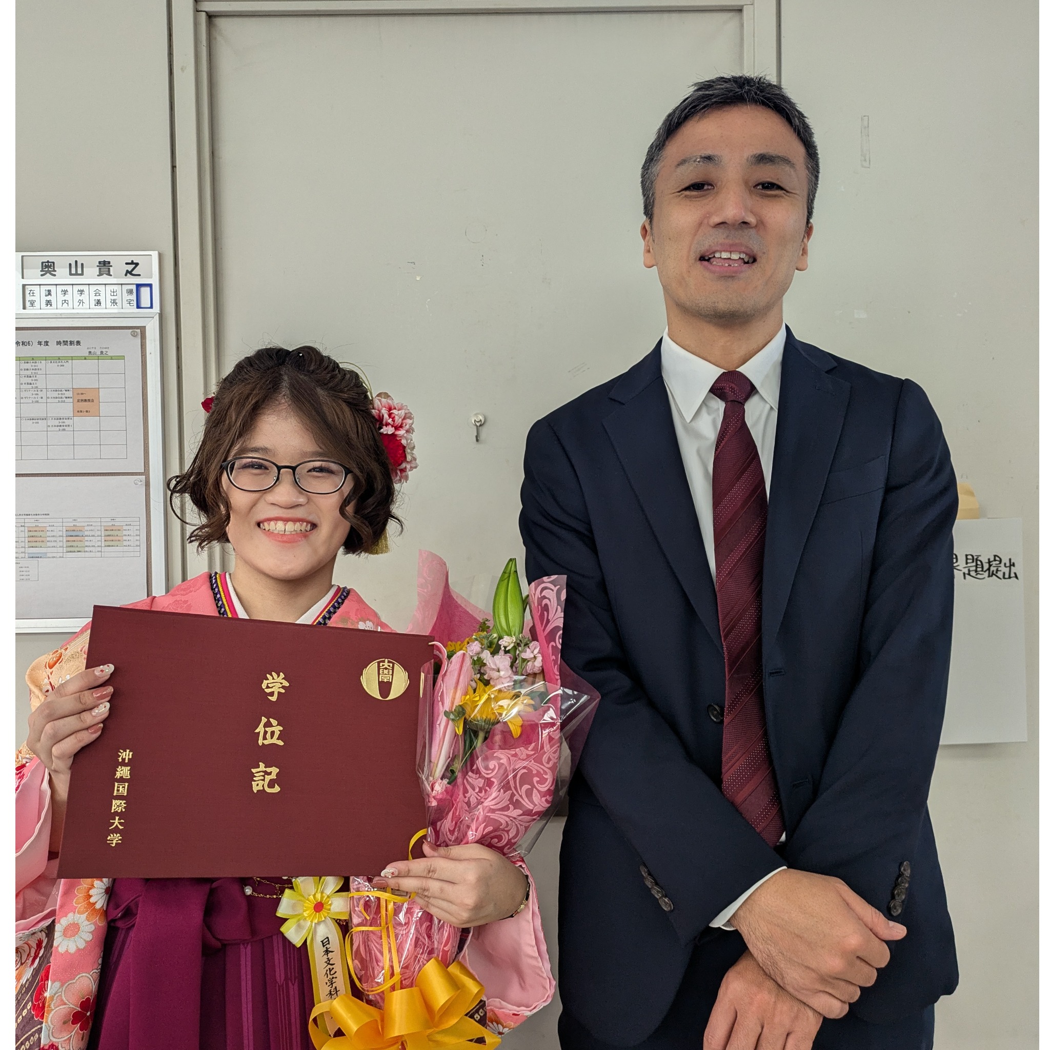 そして、4年生になると、本格的に卒業論文の調査と執筆が始まりました。卒業論文の調査と執筆では、大変なことや想定外のことも多かったと思います。奥山先生からたくさんのアドバイスをいただきながら書き上げた卒業論文が完成した時には、達成感と感動が同時に湧き上がったことを覚えています。