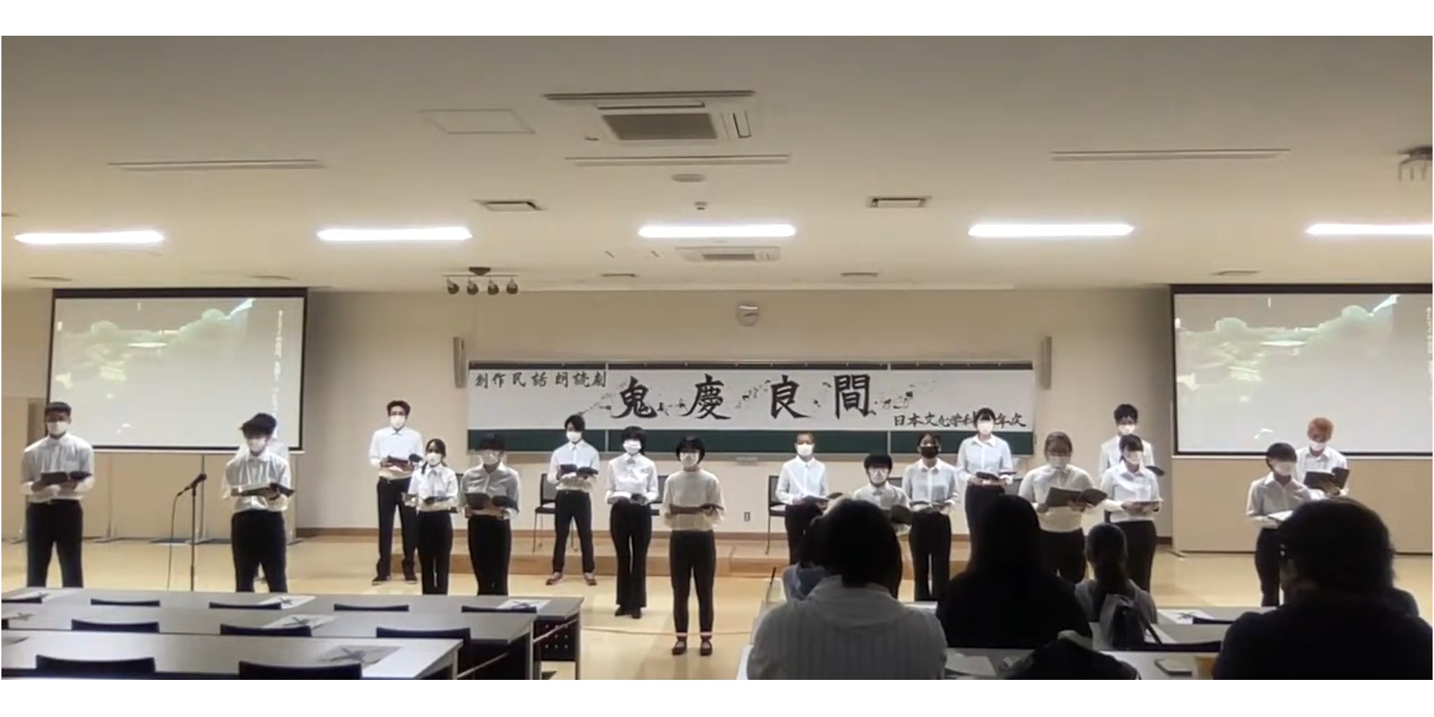 まず、印象に残っているのは、「プロジェクト演習」の講義での「鬼慶良間」です。コロナ禍での「鬼慶良間」は、例年の小道具や衣装を使ったものとは違い、朗読劇という形になりました。私は、キャストを務め、祝女神と老婆役という全然違う二役を演じることになりました。朗読劇では、声だけで感情を表現しないといけないなど難しい場面が多くありました。しかし、何度も練習を繰り返し、たくさんの人と作り上げた鬼慶良間は、私たちの代でしか表現できない、工夫と努力が詰まった作品となり、多くの人の心に届いたと思います。たくさんの人とコミュニケーションをとって作り上げた鬼慶良間は、最高の思い出となりました。