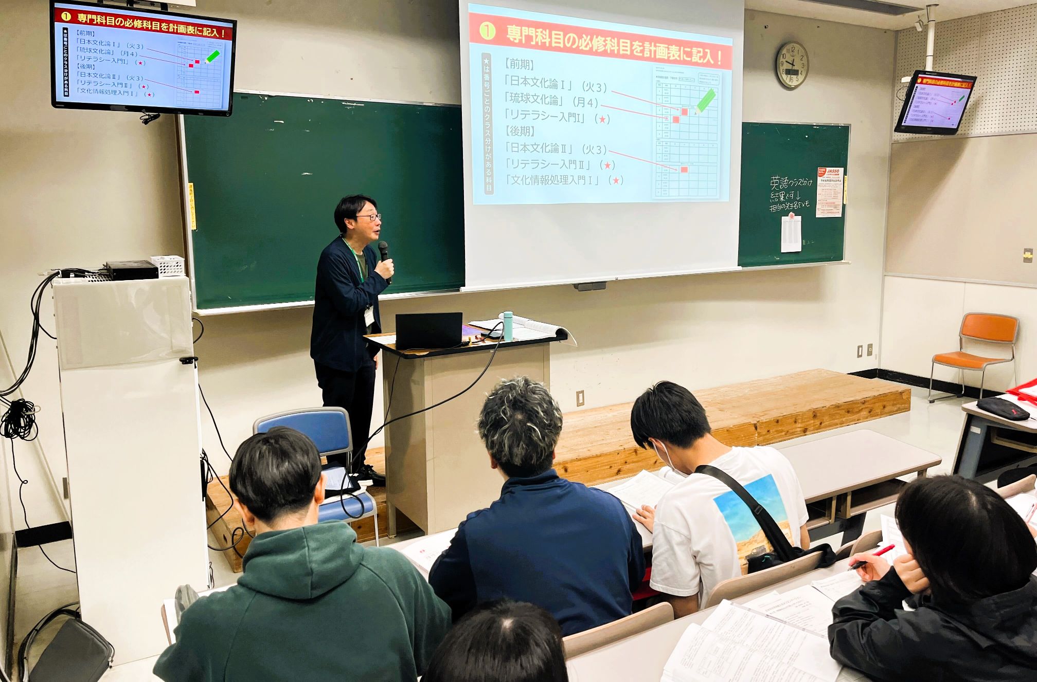 などなど、はじめて知る言葉ばかりで、戸惑った新入生も多かったようですが、各クラスの担任の先生たちや、国語科教職課程・司書課程・日本語教育副専攻課程担当の先生たちにもサポートしてもらいながら、少しずつですが、1人1人が自分のペースで大学の授業登録のシステムをマスターしていっている様子が印象的でした。