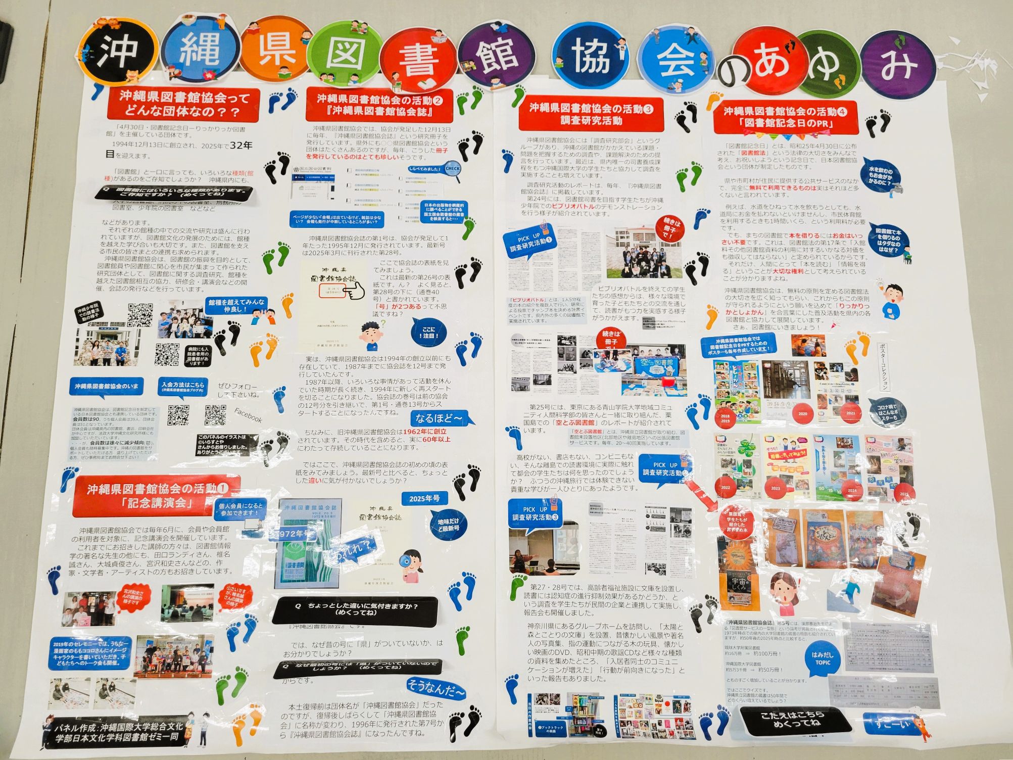 ポスターでは、全国でも珍しい、館種を超えた研究活動を長く続けている沖縄県図書館協会のあゆみ(歴史)を紹介しつつ、学生たちの調査研究活動を紹介するコーナーも大きく掲載されています。