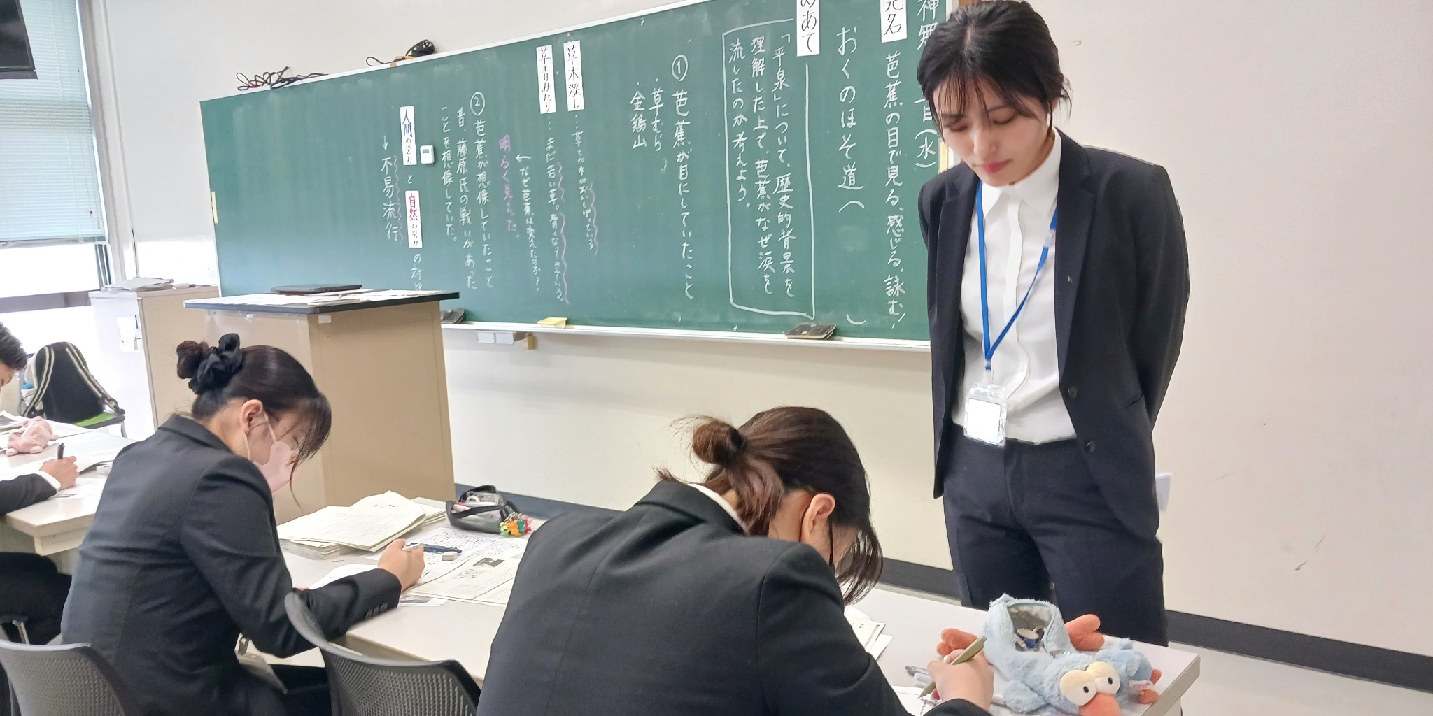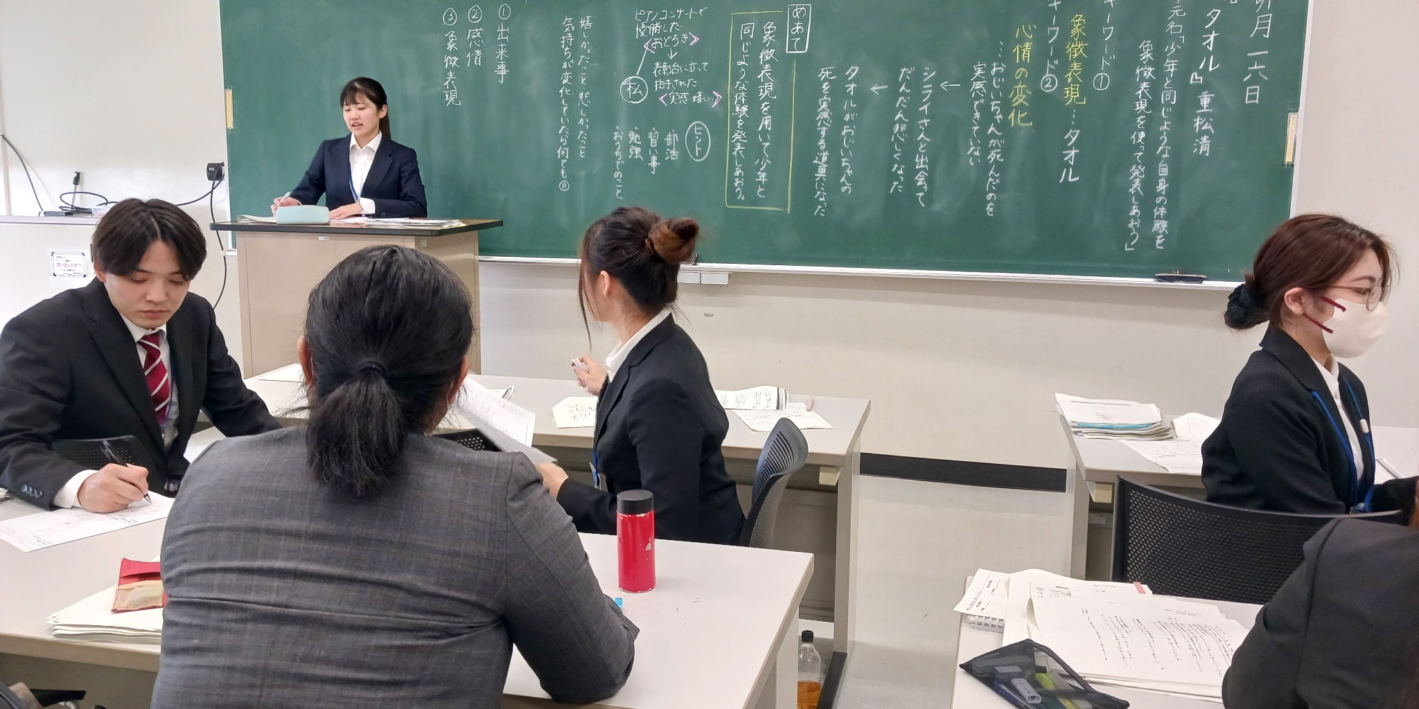 日本文化学科の教職課程では、2月16日(日)に教職行事「春期模擬授業」を行いました。3年次の12人が、1~4年の教職履修生を生徒に見立てて、授業実践を行いました。扱った教材は、中学「グループディスカッション」「初恋」「作られた「物語」を超えて」「竹取物語」、高校「羅生門」「十八史略」などなど。今回は、生徒役として授業を受けた2年次の学生が、教職課程や模擬授業の様子を紹介します。