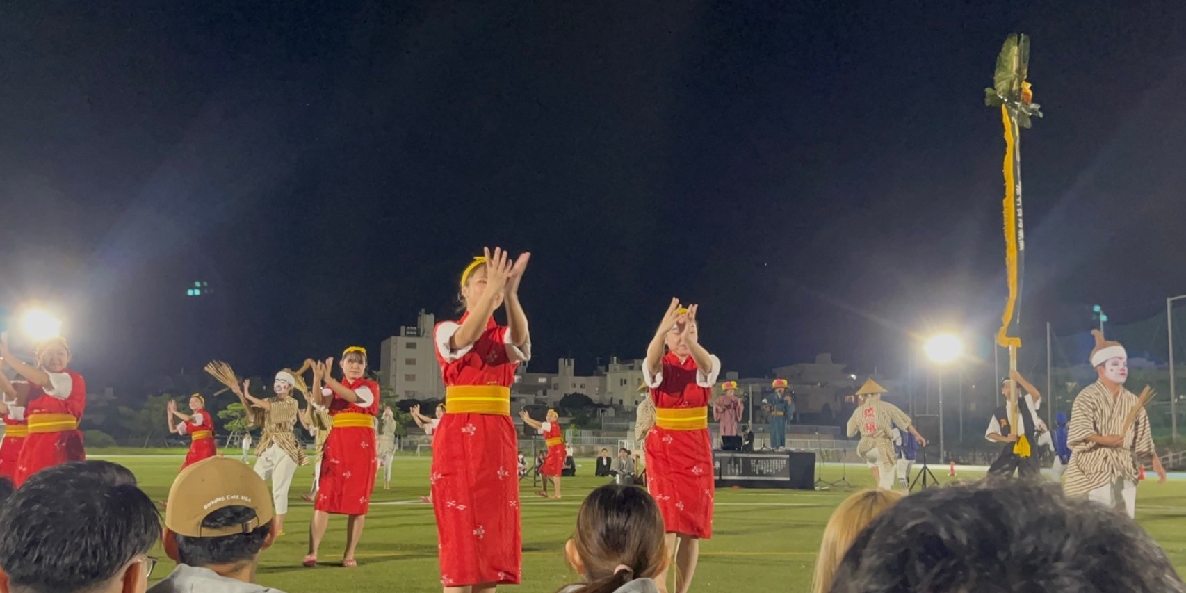 現在、現役の学生と社会人支部を合わせると、約400人のメンバーがいます。その中には、沖国の国内協定校の桜美林大学にある「桜風エイサー(おうかじエイサー) 琉球風車」のメンバーも含まれています。様々な背景を持った人が集まり、ひとつになってエイサーを踊るのはすごく楽しいです!県外、国外から沖国に来て「エイサーって何?」という方も、安心してください。私達のほとんどがエイサー初心者でした。もちろん、県外から来た先輩にはエイサーを知らなかった人もいます。たくさん友達ができることは間違いないので、ぜひ一度見学に来てください!
