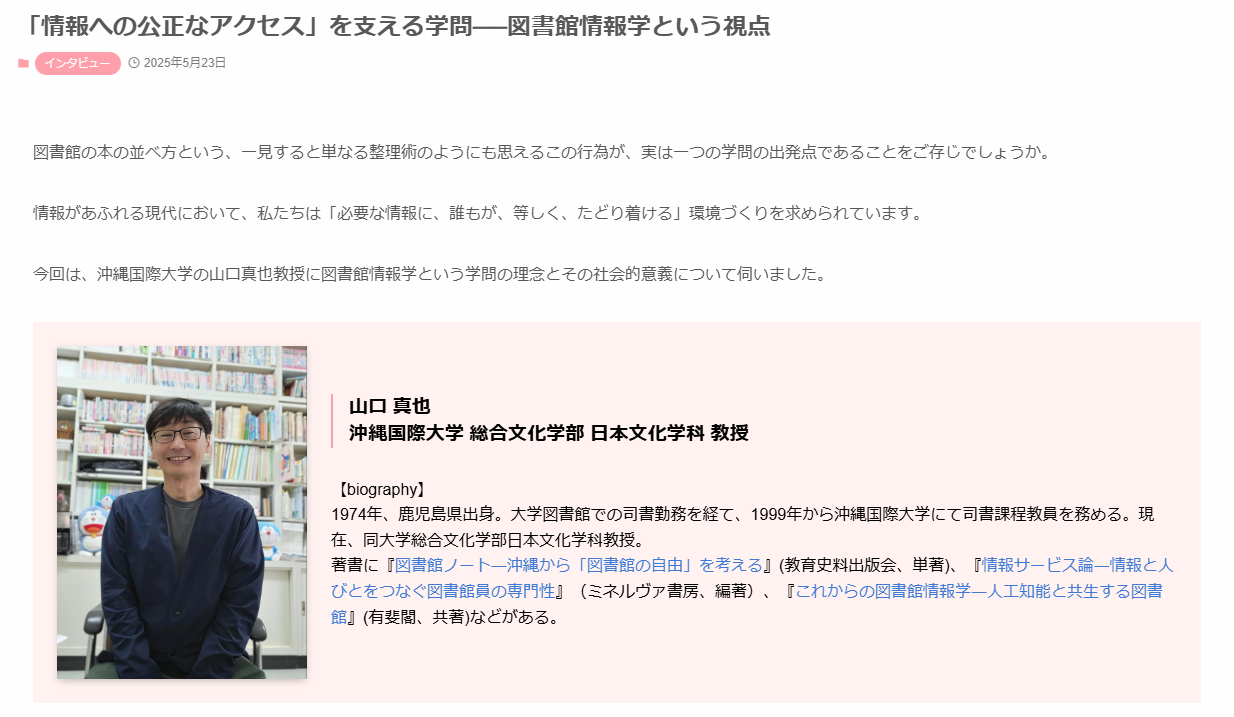 日本文化学科で図書館司書課程の授業を担当している山口先生のインタビュー記事がナレッジアート合同会社のHP(インタビューページ)に掲載されています。