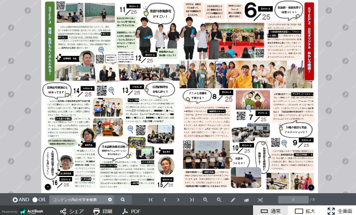 パンフレットは、A4サイズ、全8ページとなっており、大学案内の学科紹介ページに収まりきらなかった、日本文化学科の「いま」をお届けする内容になっています。