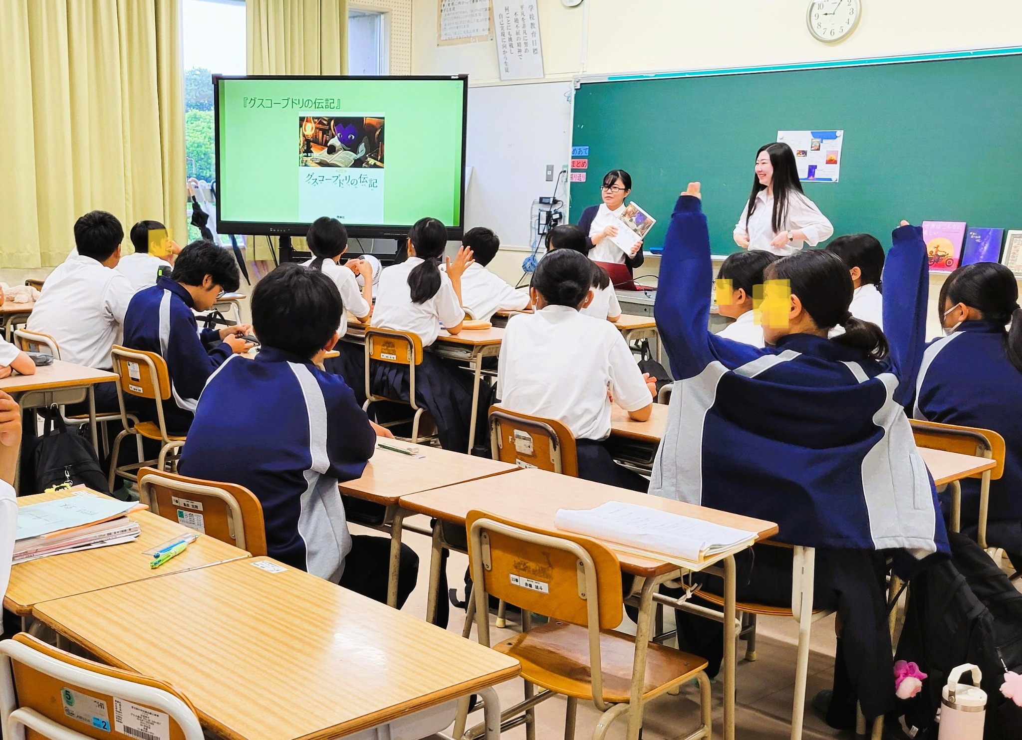 実際の子どもたちを前に、1時間の授業をたっぷり使ってのブックトークということで、学生たちはたいへん緊張した様子でしたが、本を紹介した時の生徒たちの素直な反応がはげみにもなり、ブックトークの難しさ・面白さはもちろん、教壇に立つことの意味についても深く学んだ一日になりました。
