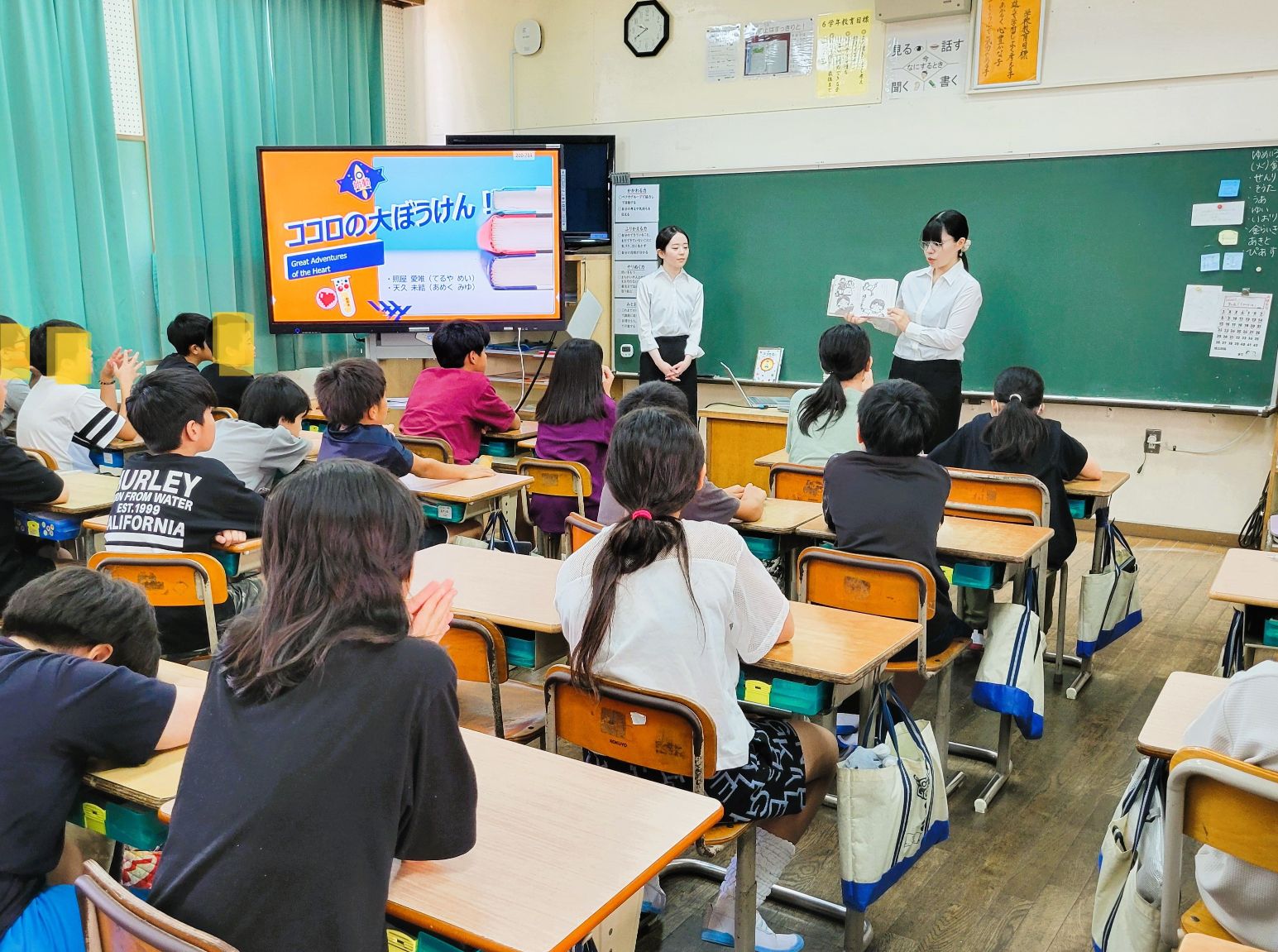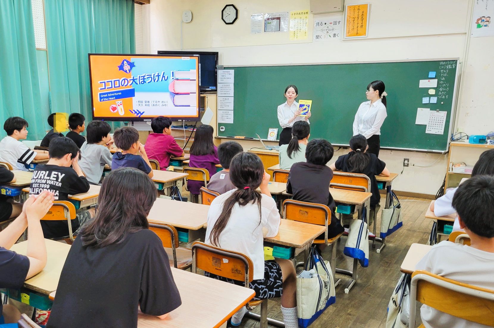 実習の舞台は小学校6年生の国語の授業。7月中旬の国語の授業で、ちょうど子どもたちが「ブックトーク」を学習することになっているそうで、そのお手本として、1時間の授業を学生たちが担当させていただくことになりました。