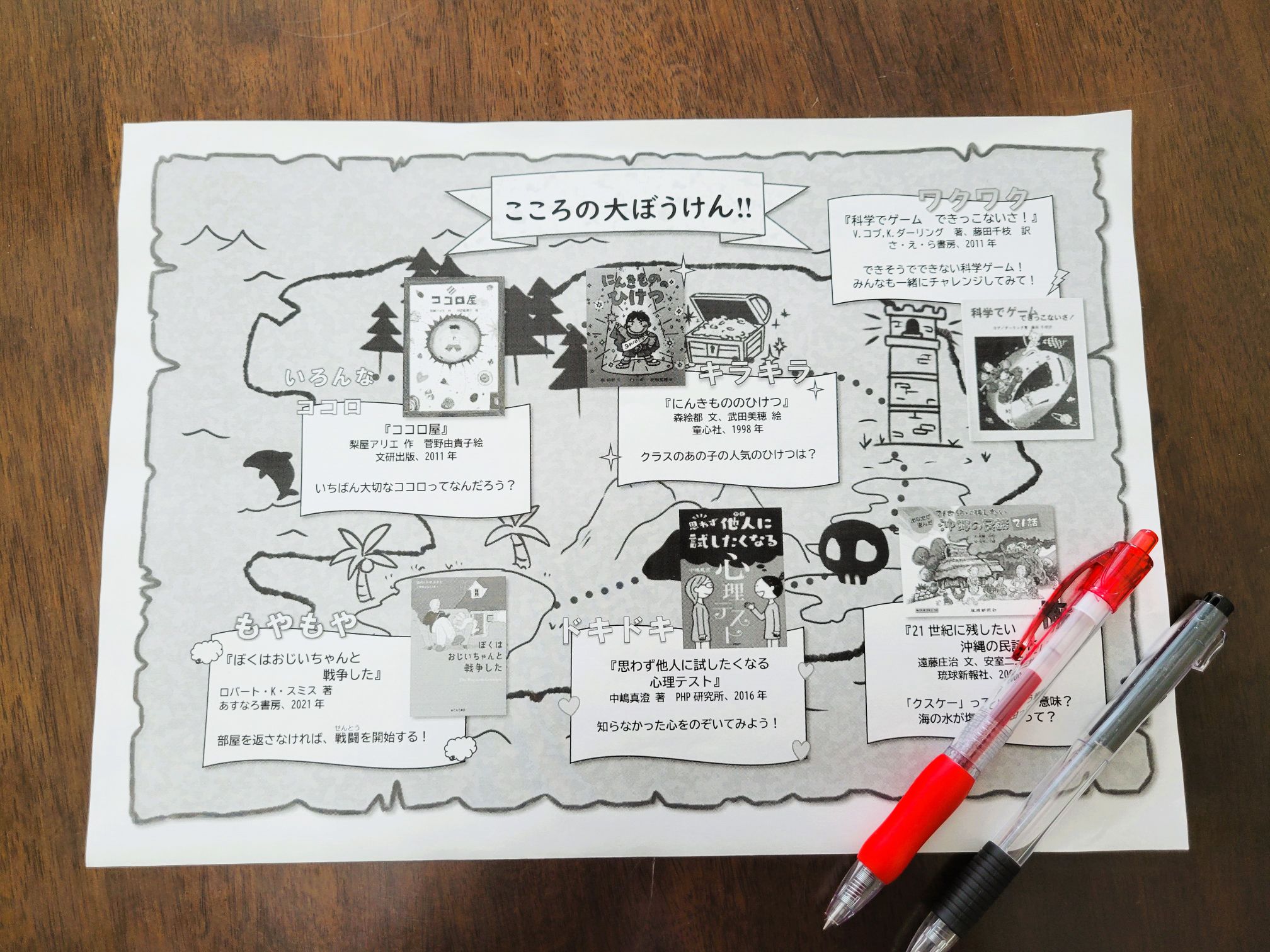 1時間目に行われた「ココロの大ぼうけん!」をテーマにしたブックトークでは、『ココロ屋』『にんきもののひけつ』『科学でゲーム できっこないさ!』『ぼくはおじいちゃんと戦争した』『思わず他人に試したくなる心理テスト』『21世紀に残したい沖縄の民話21話』の6冊を紹介しました。