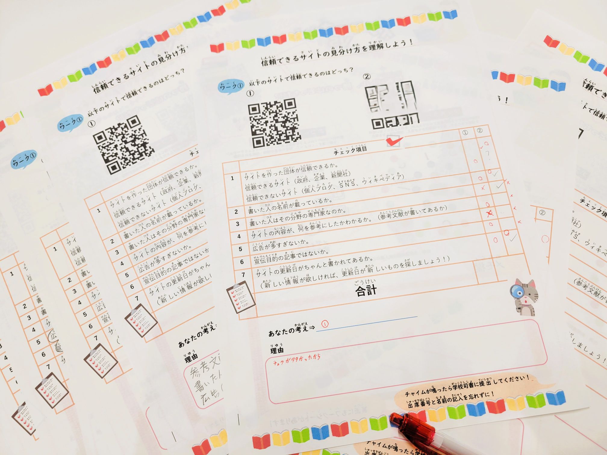 授業の後半は、もしインターネットを使用する場合には、フェイク情報などに惑わされないように、信頼できるサイトの見分け方を7つのチェックポイントをもとに解説し、「ジェンダー平等」について書かれた2つのサイトをQRコードで実際に生徒役の学生たちに見てもらって、チェック表をもとにどちらのサイトが信頼できるかを判定するワークを行いました。
