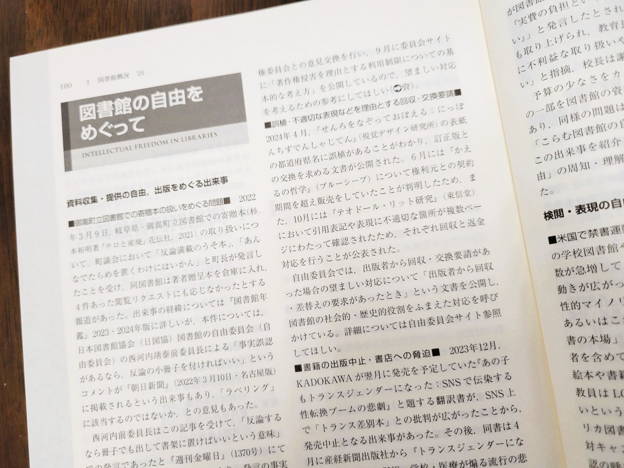 このレポートで取り上げているトピックは、御嵩町立図書館での寄贈本の扱いをめぐる問題の結末、アメリカでの禁書運動の拡大、著作権侵害を理由とする回収・制限要請への対応、PTA未加入家庭の生徒の図書館利用制限、教育データの利活用と図書館への影響、フィクションの中で繰り返されるプライバシー侵害など、さまざまな分野にわたっています。