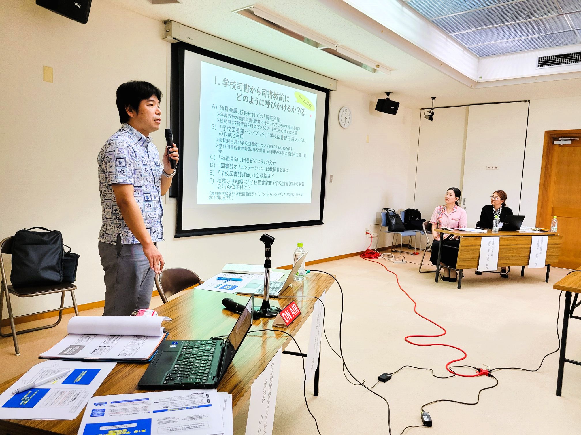 2025年8月18日、宜野湾市民図書館にて開催された、令和7年度第2回学校図書館関係職員合同研修会にて、日本文化学科で図書館情報学を担当する山口先生が、学校司書の雇用状況に関するアンケート調査結果を報告しました。