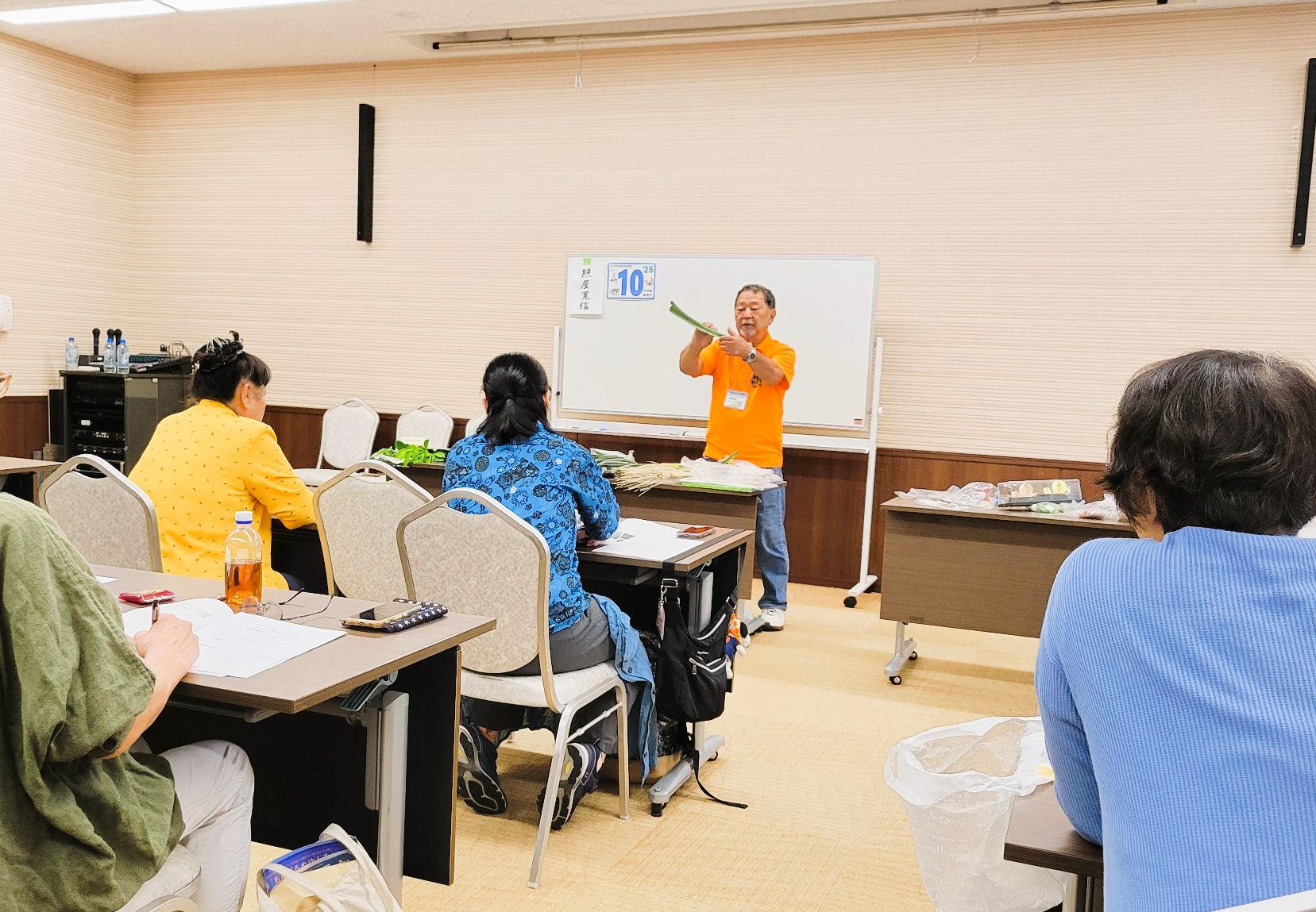 2日目の講座では、沖縄国際大学で長く教鞭をとられた遠藤庄治先生が立ち上げた、NPO法人沖縄伝承話資料センターの皆さんによる、伝承玩具づくりの講座も開催されました。伝承話資料センターの皆さんの多くは遠藤先生の教え子で、日本文化学科の前身にあたる国文学科の卒業生です。講座では、マーニやクロツグなどの沖縄の植物を使ったおもちゃづくりをみんなで楽しく体験しましたが、「文化を伝承していくためには、身近な道具を使ってもよい。植物が身近なところで採れなくなったなら、ビーズやPPバンドなど、身近にある道具を使ってもいい、形にこだわらずに、文化が途絶えないように、時には柔軟に、身近なものを使ってひろげてほしい」という言葉が印象的でした。