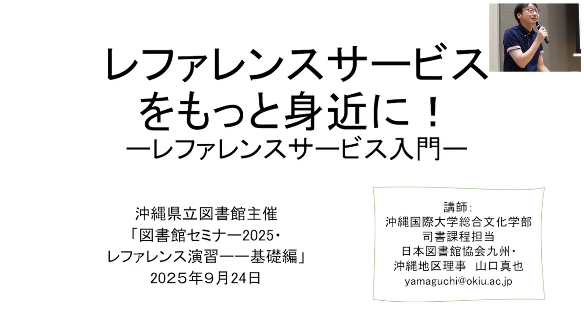 2025年9月24日、沖縄県立図書館ホールにて開催された「図書館セミナー」の講師を、日本文化学科で図書館学の授業を担当する山口先生が担当しました。