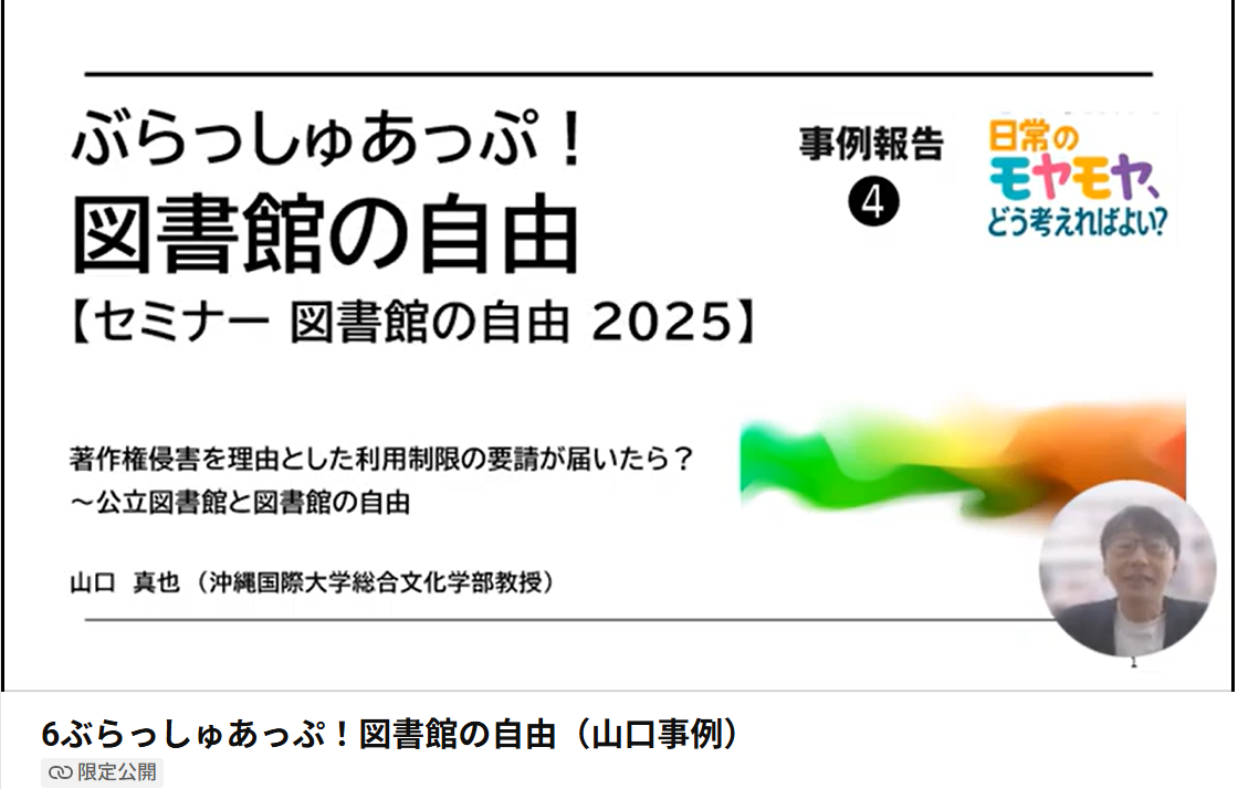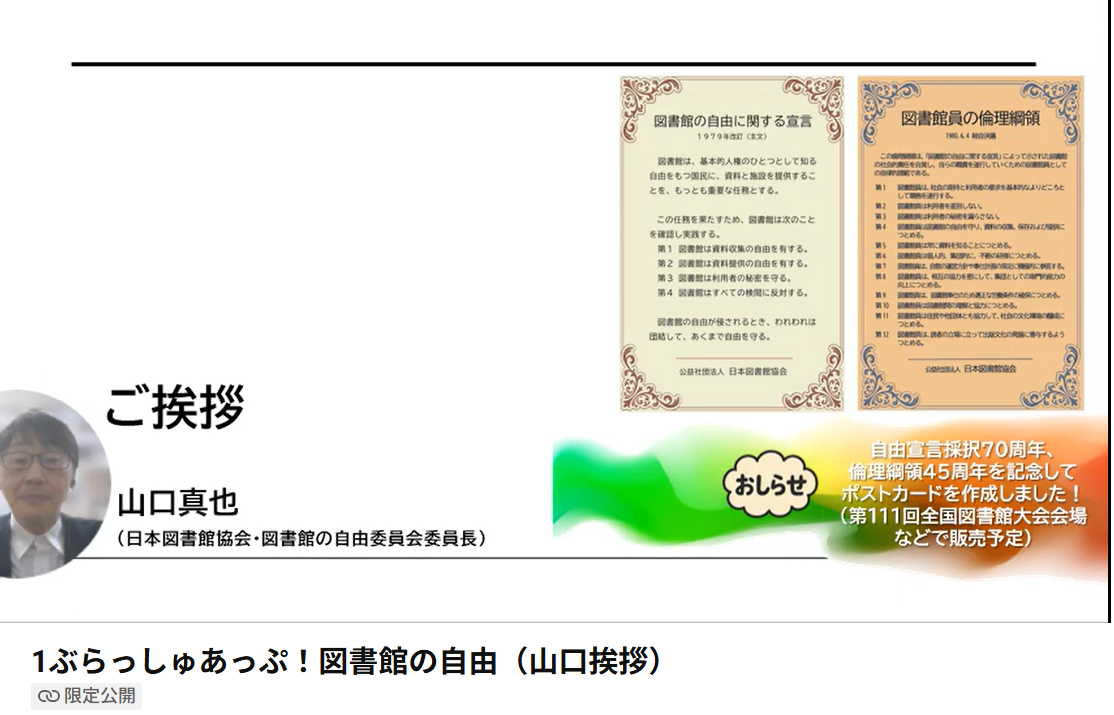 山口先生が担当するのは、日本図書館協会・図書館の自由委員会による「図書館の自由セミナー」の委員長挨拶と事例報告の1コマ。
