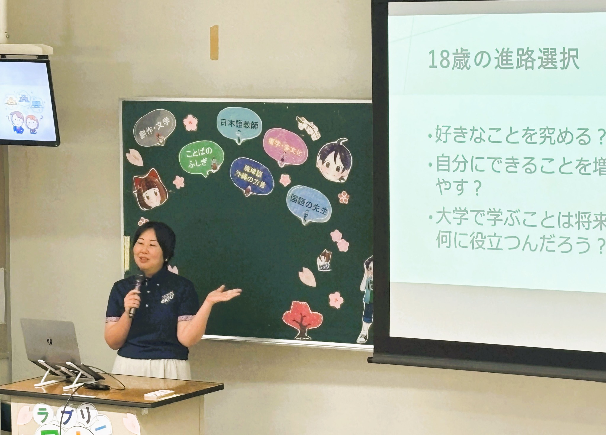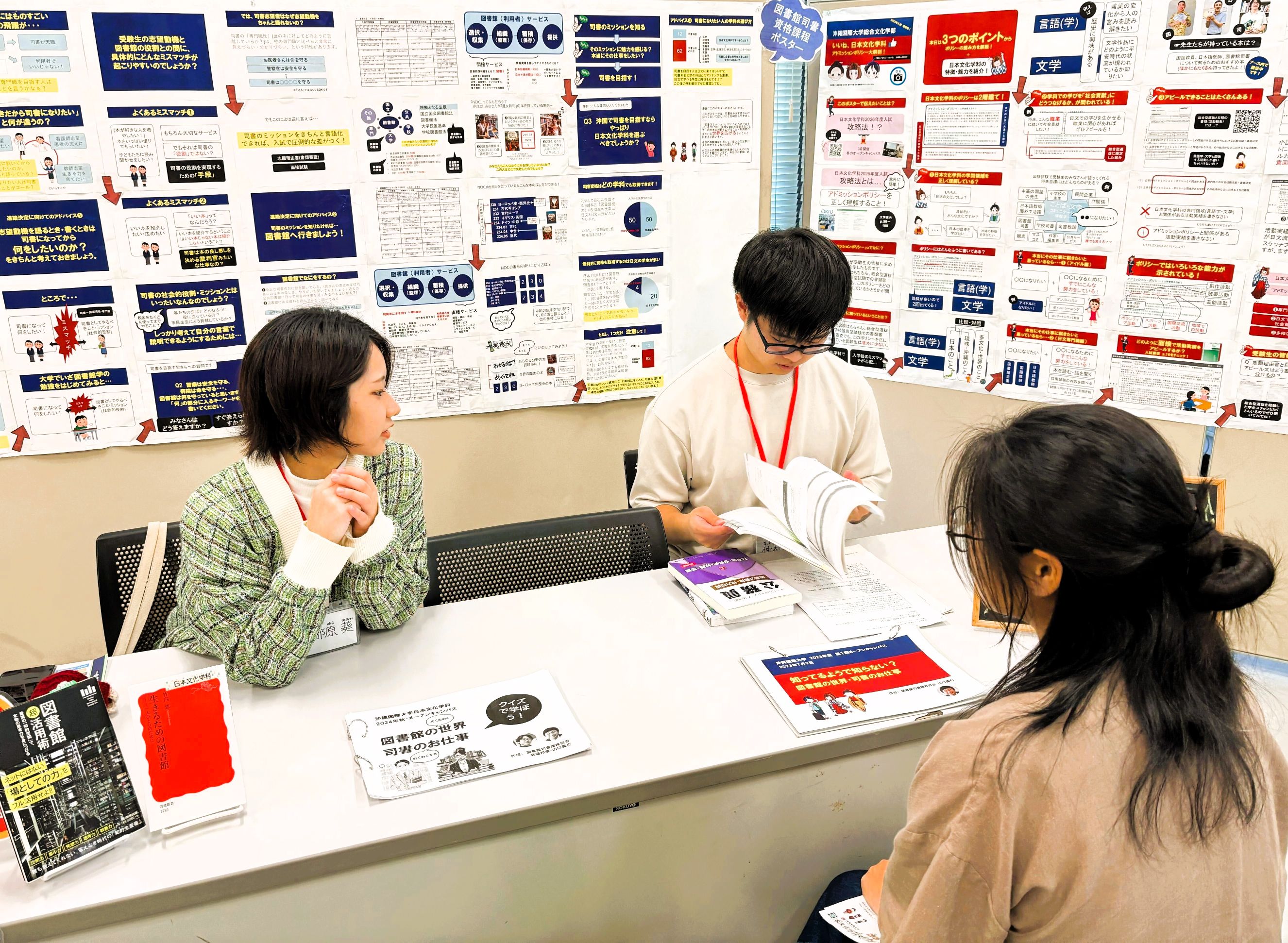 来場者からは、国語の先生や学校司書として高校現場でがんばっている卒業生の近況も聞くことができました。先生たちも元気そうな様子を聞いて一安心しつつ、学校現場へ専門職を輩出している日文だからこそのアットホームなオープンキャンパスのなりました。