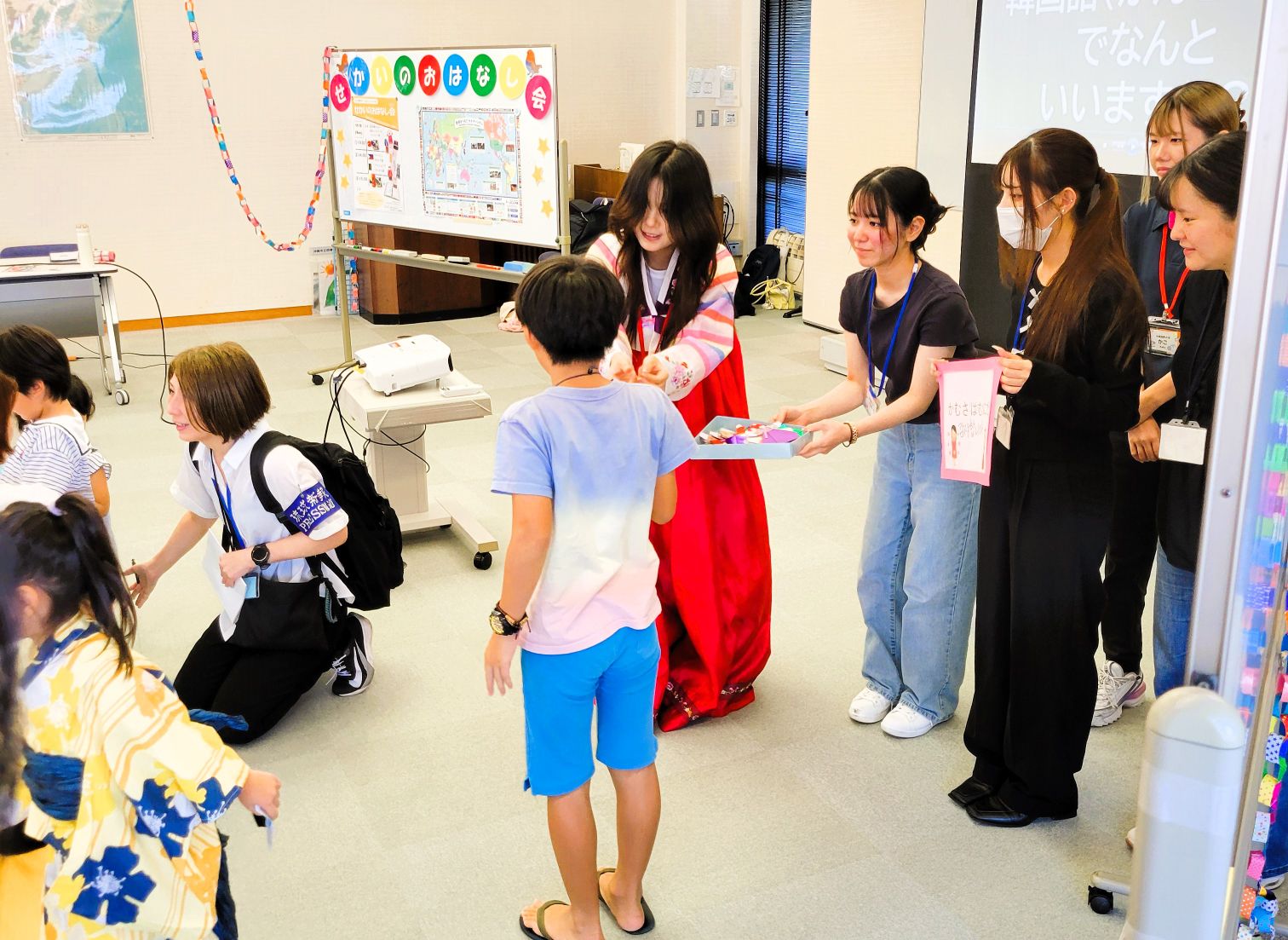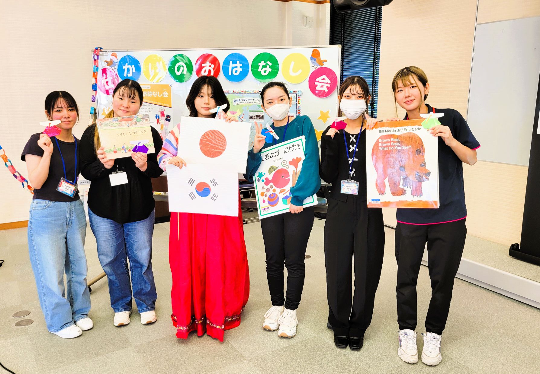 ユナさんからは、おはなし会に参加してくれた子どもたちへ、折り紙でつくったチマチョゴリを子どもたち一人一人に手渡してくださいました。